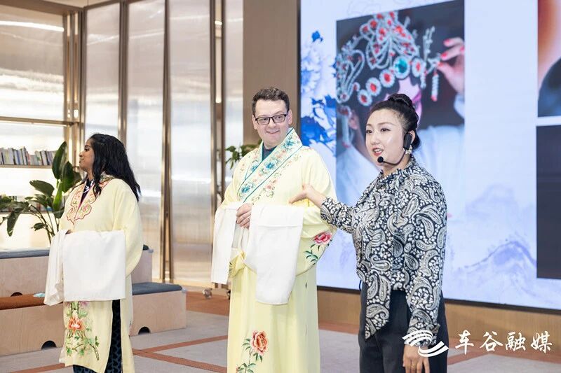 汉剧展示环节,国家一级演员王荔从唱、做、唸、打、手、眼、身、法、步、服饰、道具等方面,讲述汉剧特点、发展历程,即兴表演经典汉剧,指导外籍友人“打水袖”,将活动气氛推向高潮。