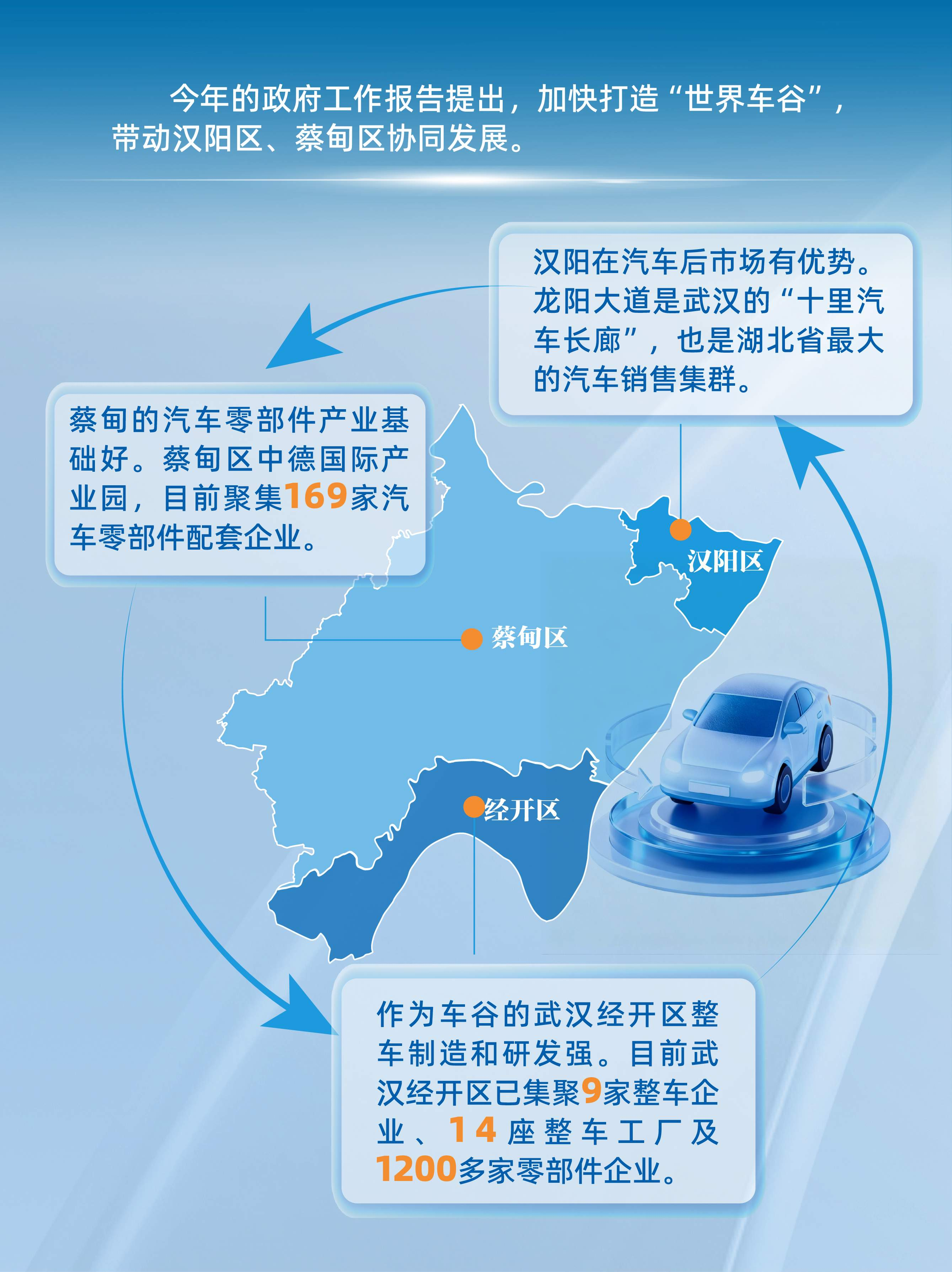 为何是这三地协同?记者围绕这个问题问了问三地相关部门,简单概括就是,三地的产业有互补性——武汉经开区整车制造和研发强,蔡甸的汽车零部件产业基础好,而汉阳在汽车后市场有优势。