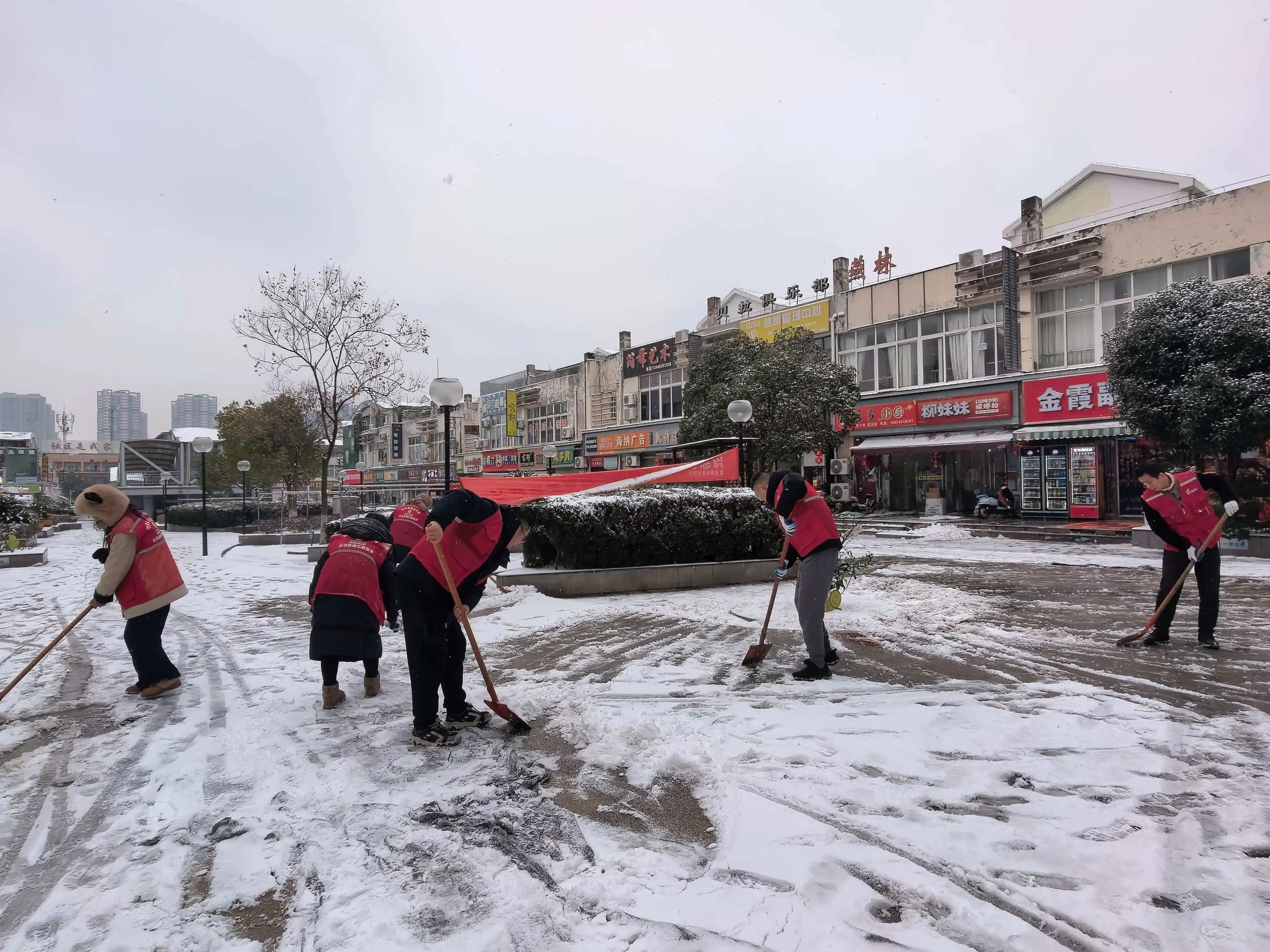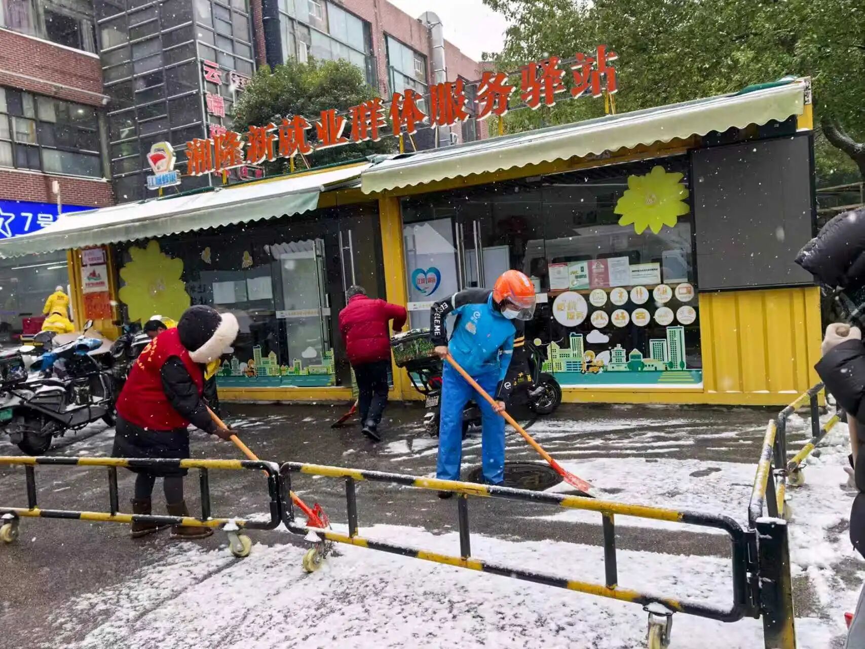 面对低温雨雪天气,武汉经开区及时发布《致全体车谷人的扫雪除冰倡议书》,各街道、社区积极组织党员干部、志愿者,对公交站台、地铁口、有轨电车站、公厕及人行天桥等人员密集、易结冰区域,开展人工除雪、撒盐作业,全力保障市民出行安全与畅通。