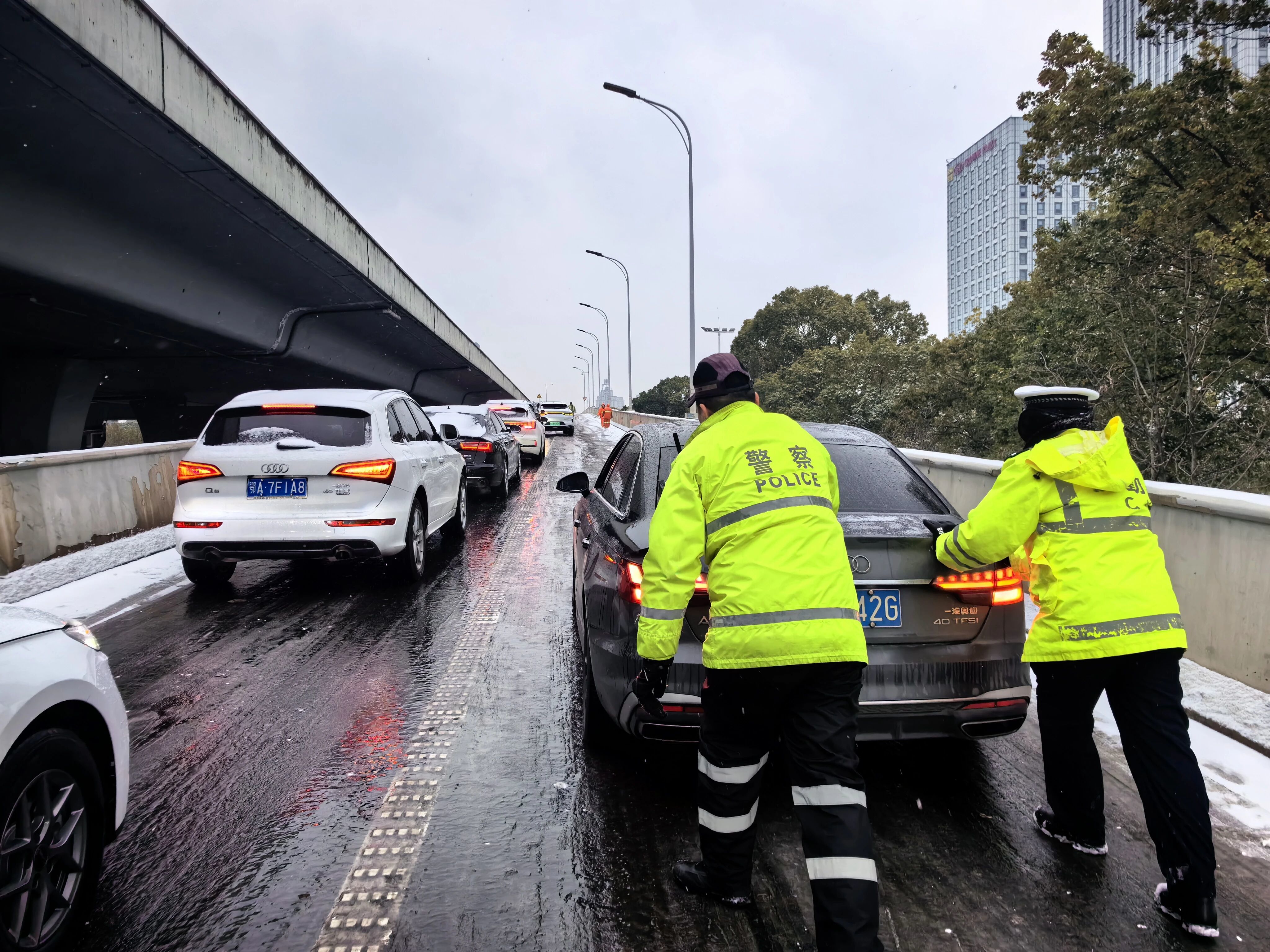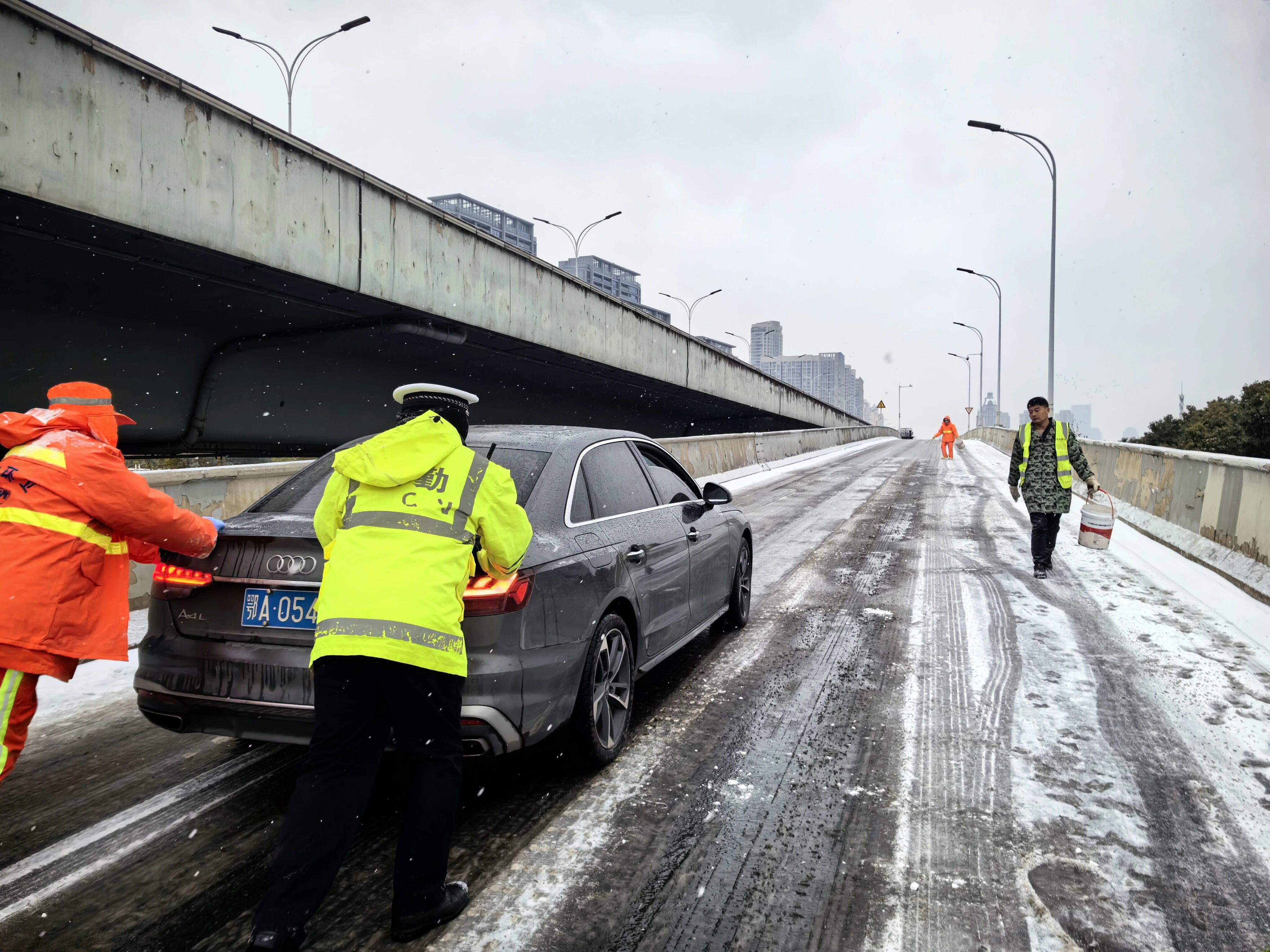 “一二三,推!”清晨7时许,在东风大道三角湖匝道处,一声声整齐的号子穿透风雪。由于坡道积雪、轮胎打滑,不少车辆在原地空转难以前行。武汉经开区公安分局交通管理大队民警林翔、洪成、殷政和辅警吴奎、彭文睿一边提醒后方车辆减速慢行,一边俯身帮助司机一辆接一辆推车上坡。根据气象预警,武汉经开区交警提前启动应急响应,针对桥梁、匝道等重点路段预先部署值守警力。早高峰时段,大队全员出动,累计出动近300人次,连续助推打滑车辆500余辆,确保“每个匝道有人守、每起险情及时处”。