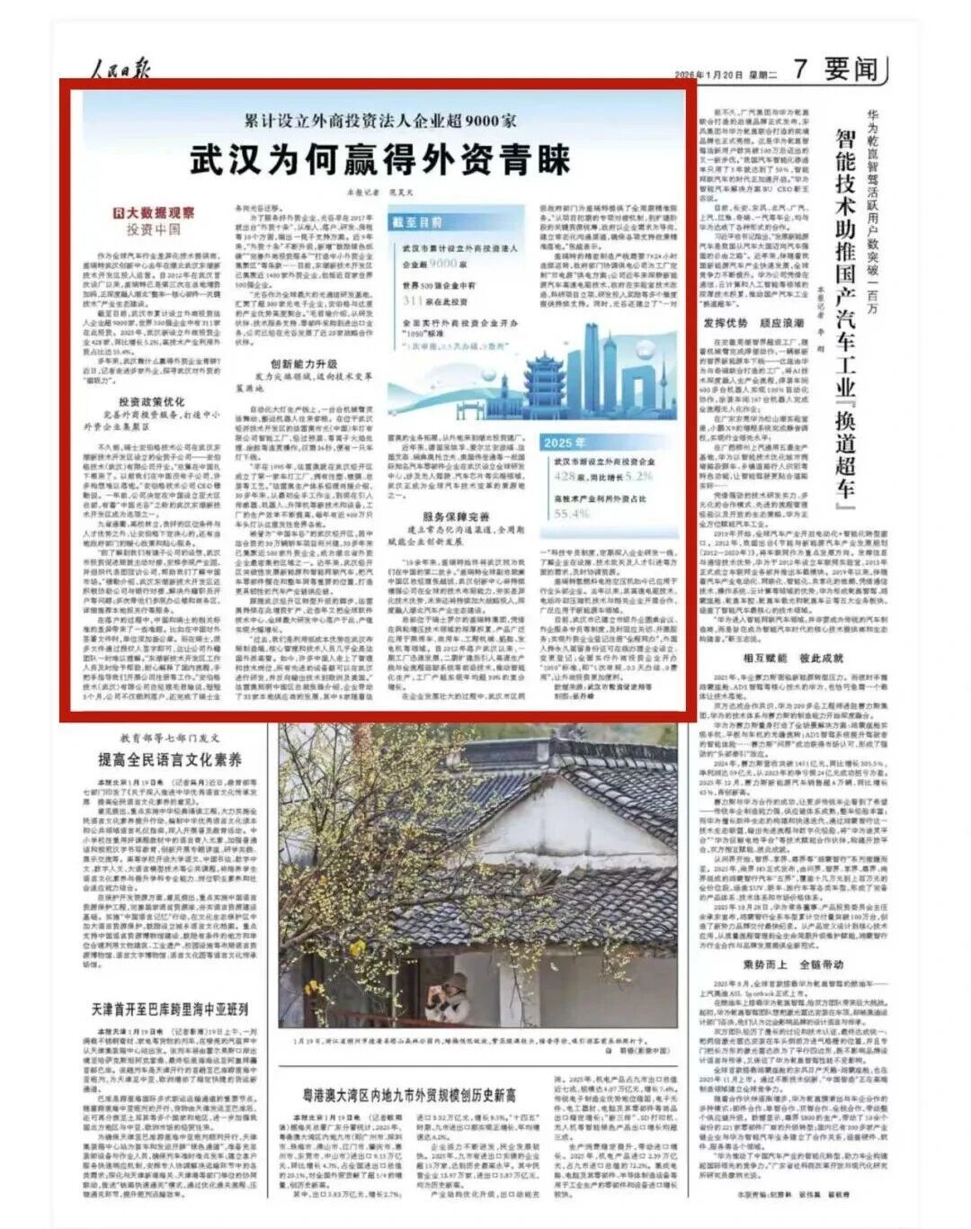 1月20日,《人民日报》要闻版刊发了题为《累计设立外商投资法人企业超9000家 武汉为何赢得外资青睐》的专题报道,聚焦法雷奥、盖瑞特等头部外资企业,深入展现武汉在吸引外资、优化营商环境等方面的积极成效。以下为全文:
