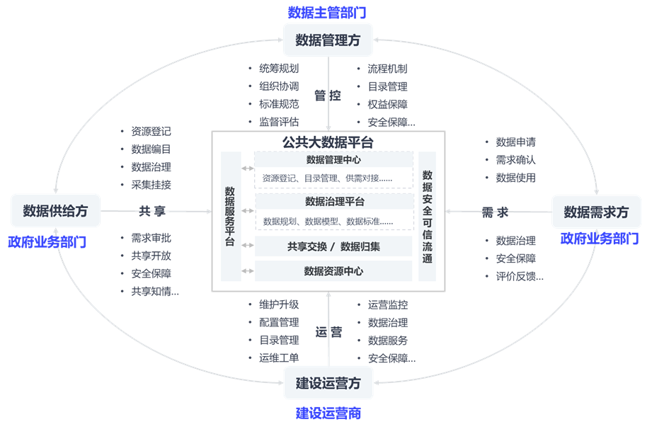 中国电子云一体化公共大数据体系遵循“以用促建促治、共建共治共享、数据应归尽归、合理合规利用”的核心理念,由数据管理方、数据供给方、数据需求方、建设运营方共同参与,利用公共大数据平台提供的共享交换、数据归集、数据治理、数据管理、数据服务等能力,实现全域政务数据登记、编目、采集、挂接、治理、共享、开放、安全、维权、监督的全链路运营闭环,促进政务数据的高效共享和利用。