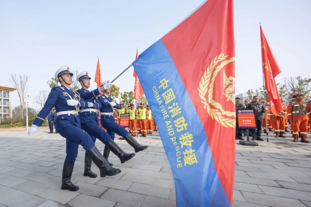 仪式现场,中国消防救援队队旗在仪仗队员护卫下入场,千名指战员整齐列队、精神昂扬,共同见证这一凝聚使命、开启新篇的重要时刻。