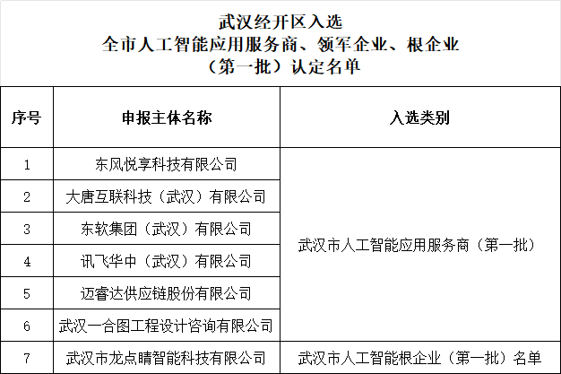 近日,全市人工智能应用服务商、领军企业、根企业(第一批)认定名单公布,武汉经开区7家企业入选。其中,东风悦享科技有限公司、大唐互联科技(武汉)有限公司等6家企业入选人工智能应用服务商,武汉市龙点睛智能科技有限公司入选人工智能根企业。
