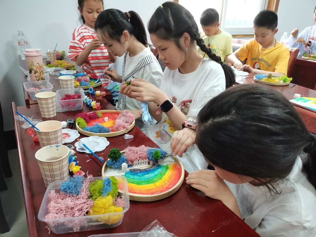 在大家的努力下,一个个精致绝伦的园林微景观如同魔法般逐渐成形。孩子们看着自己亲手打造的劳动成果,脸上绽放出自豪的笑容。