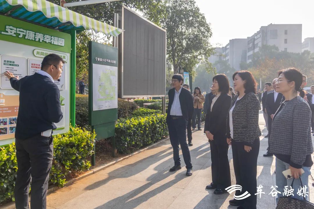 在宁康园社区,市、区政协委员实地调研“二次供水”改造点、社区中心广场、一站式养老中心辐射点展厅、幸福食堂,点赞宁康园社区“共同缔造”成果。
