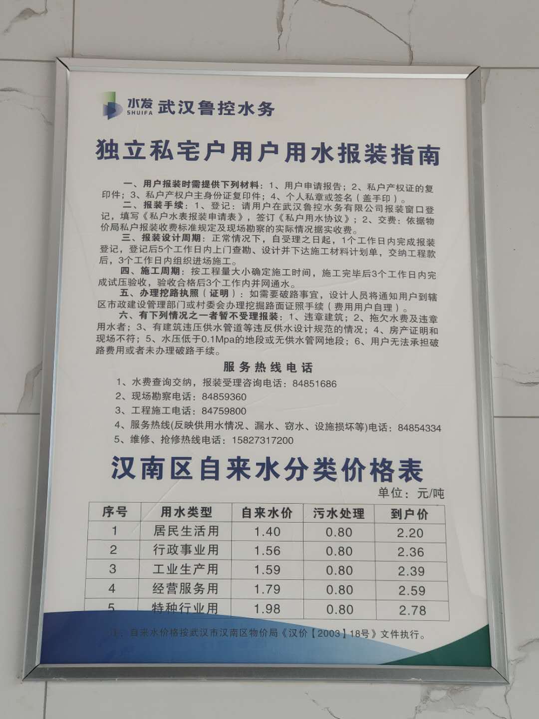 1.登记:请用户在武汉鲁控水务有限公司报装窗口登记,填写《私户水表报装申请表》,签订《私户用水协议》;