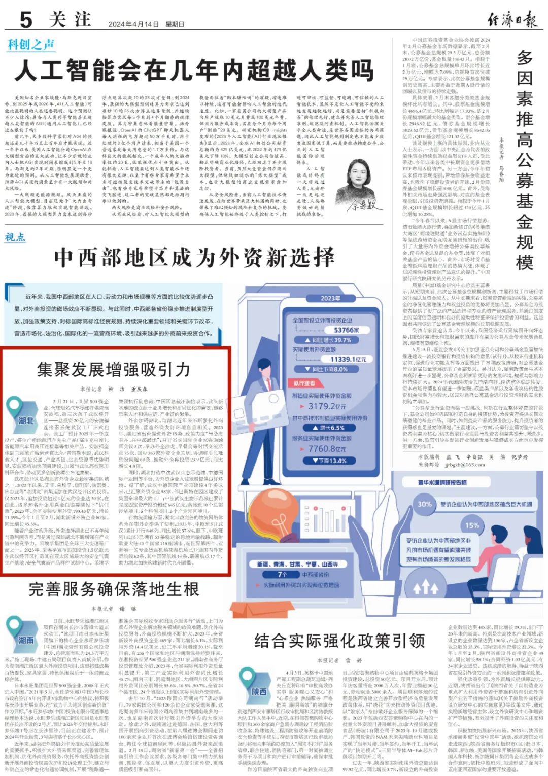 4月14日,《经济日报》第5版围绕主题“中西部地区成为外资新选择”,分别介绍了湖北、湖南、陕西三省打造外商投资“强磁场”的先进经验。其中,湖北重点报道了安波福、采埃孚等知名外企纷纷“加码”武汉经开区、持续投下“信任票”,展现出湖北厚植外企投资兴业沃土的生动实践。报道如下: