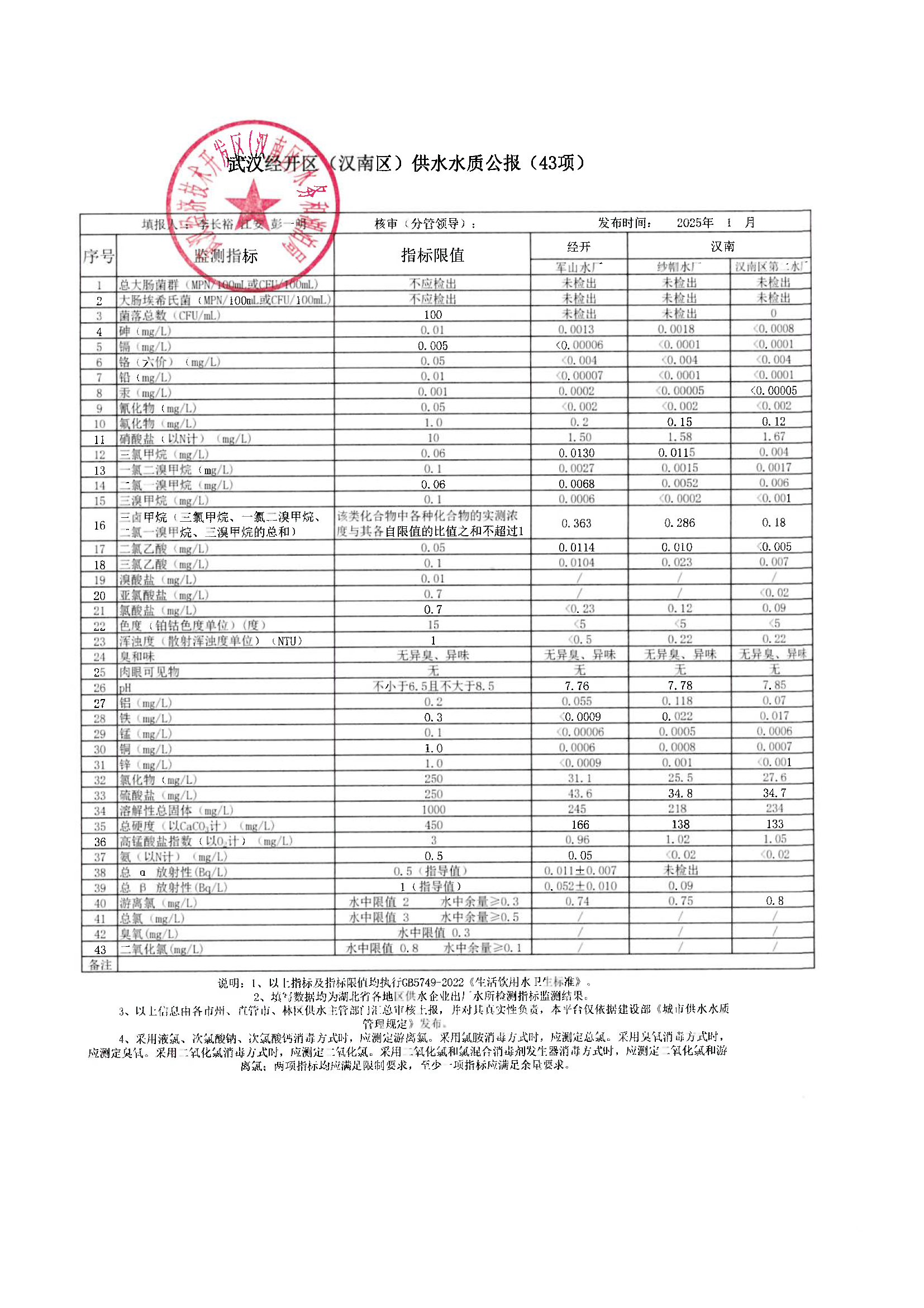 武汉经济技术开发区(汉南区)2025年1月城市供水水质公报