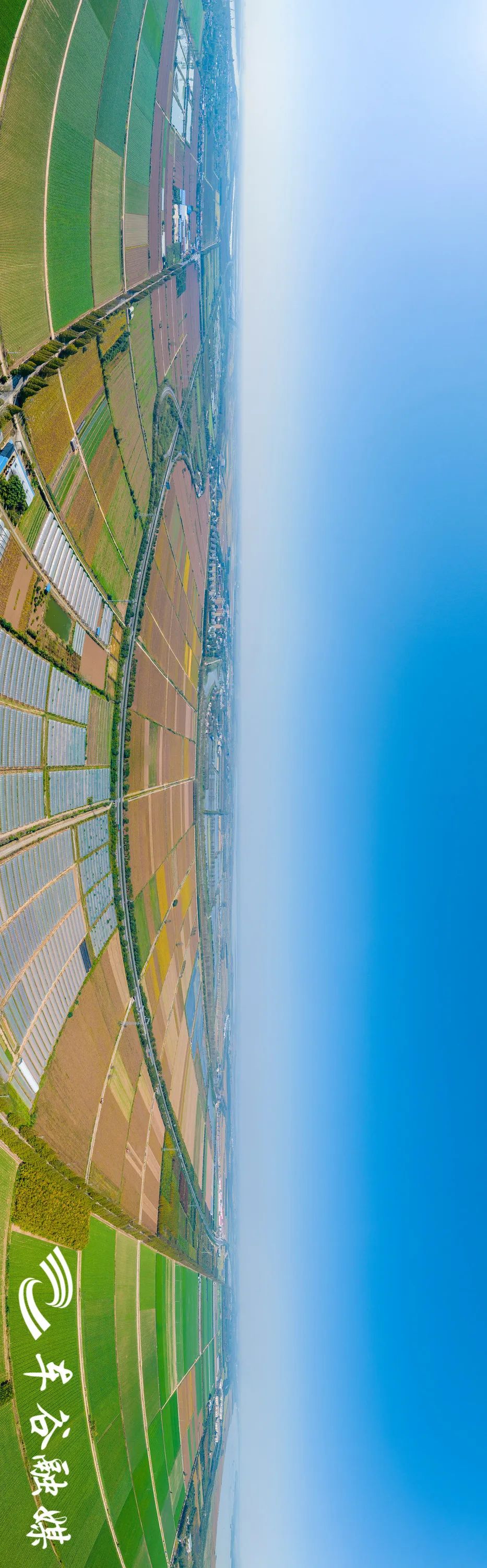 穿过一片村居房舍,眼前出现一大片菜地。菜垄齐齐整整,绿意从脚下向田野的尽头铺展开去。路的另一侧,满目金黄,对比鲜明。
