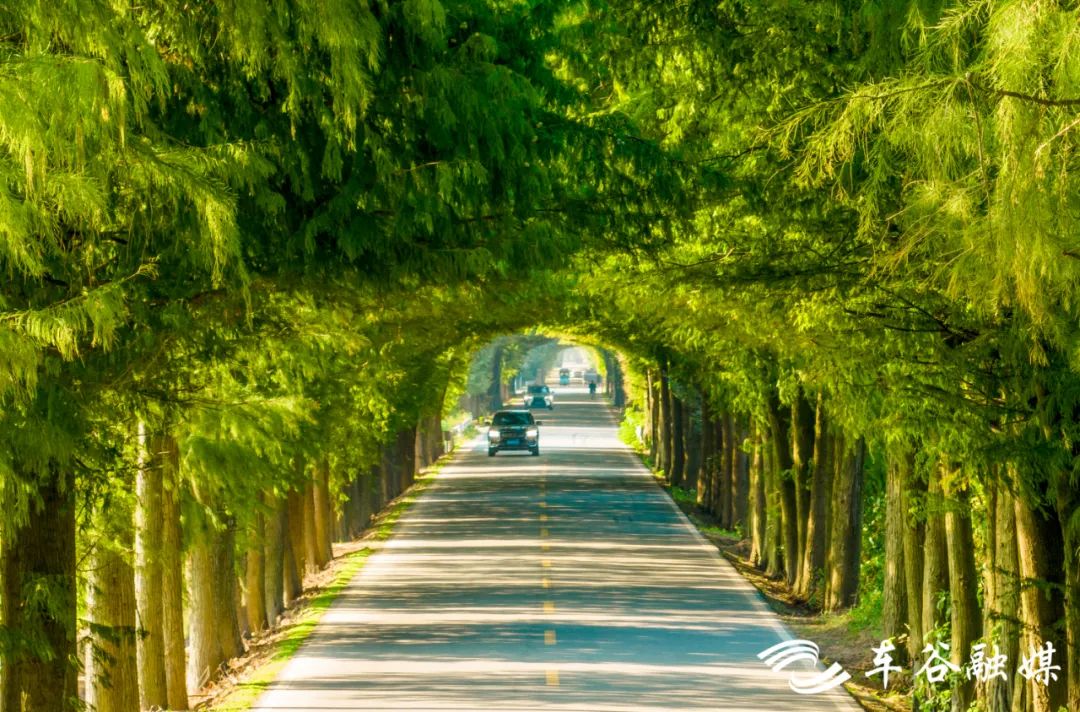 穿行于绿色长廊,朝阳透过绿叶的缝隙,投射到柏油路上,投射到身上,斑斑点点,如入仙境。