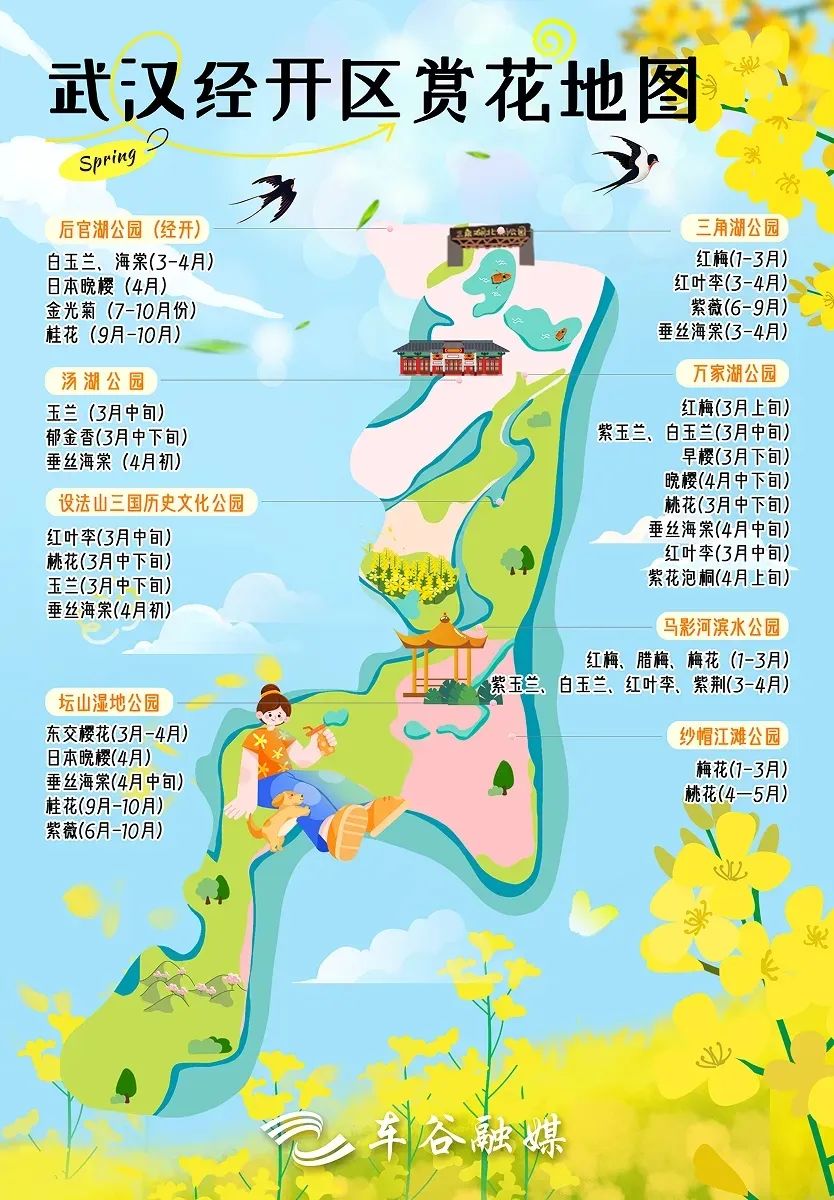 春有约花不误,武汉经开区还有多个赏花“打卡点”。眼下,在坛山岛人工湿地公园、设法山三国历史文化公园、三角湖公园、万家湖公园等景区,郁金香、樱花、红叶李、紫薇、垂丝海棠、桃花相继盛开,热热闹闹地绽放出一整个明艳的春天。