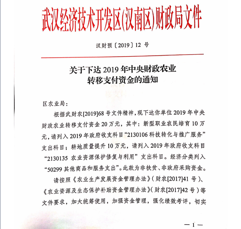汉财预[2019]12号关于下达2019年中央财政农业转移支付资金的通知