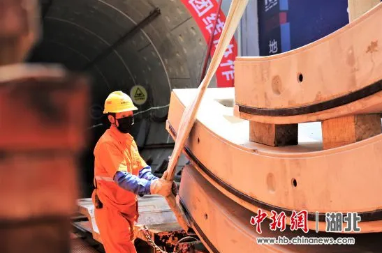 4月14日,在武汉地铁16号线川江池站至沌口站施工现场,工人正在调运管片。(唐里 摄)