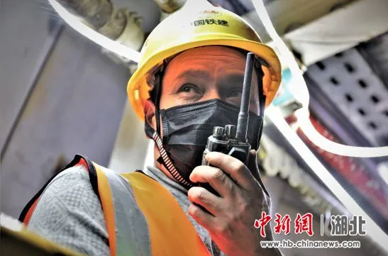 4月14日,在武汉地铁16号线川江池站至沌口站区间隧道内,工人拿着对讲机交流。(唐里 摄)