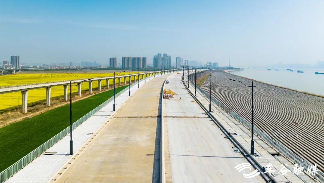 近日,美丽的油菜花在长江沿岸盛开,与正在火热建设中的左岸大道经开段项目施工现场交相辉映,构建出一幅美丽的画卷。