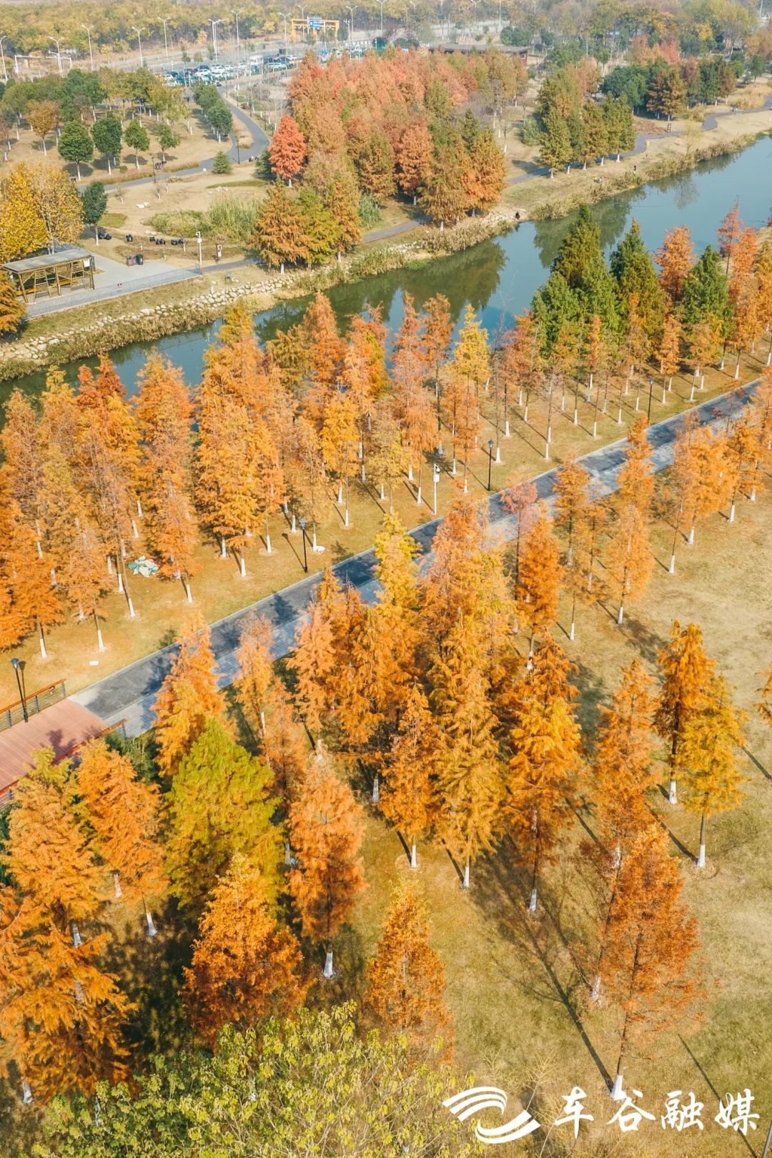 「三角湖公园」内,杉树橙黄,梧桐深红,美拉德色系的秋冬氛围感立刻拉满。