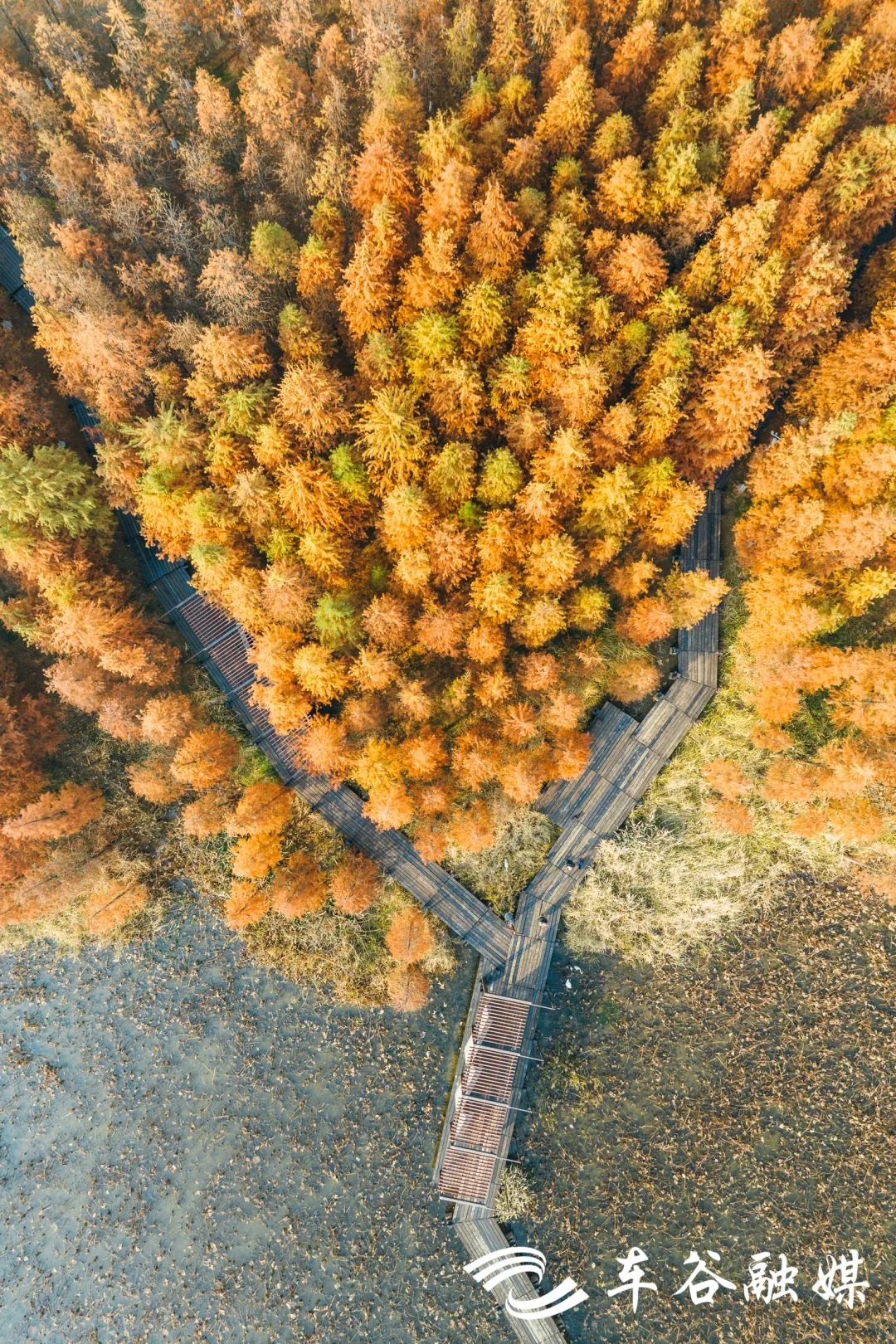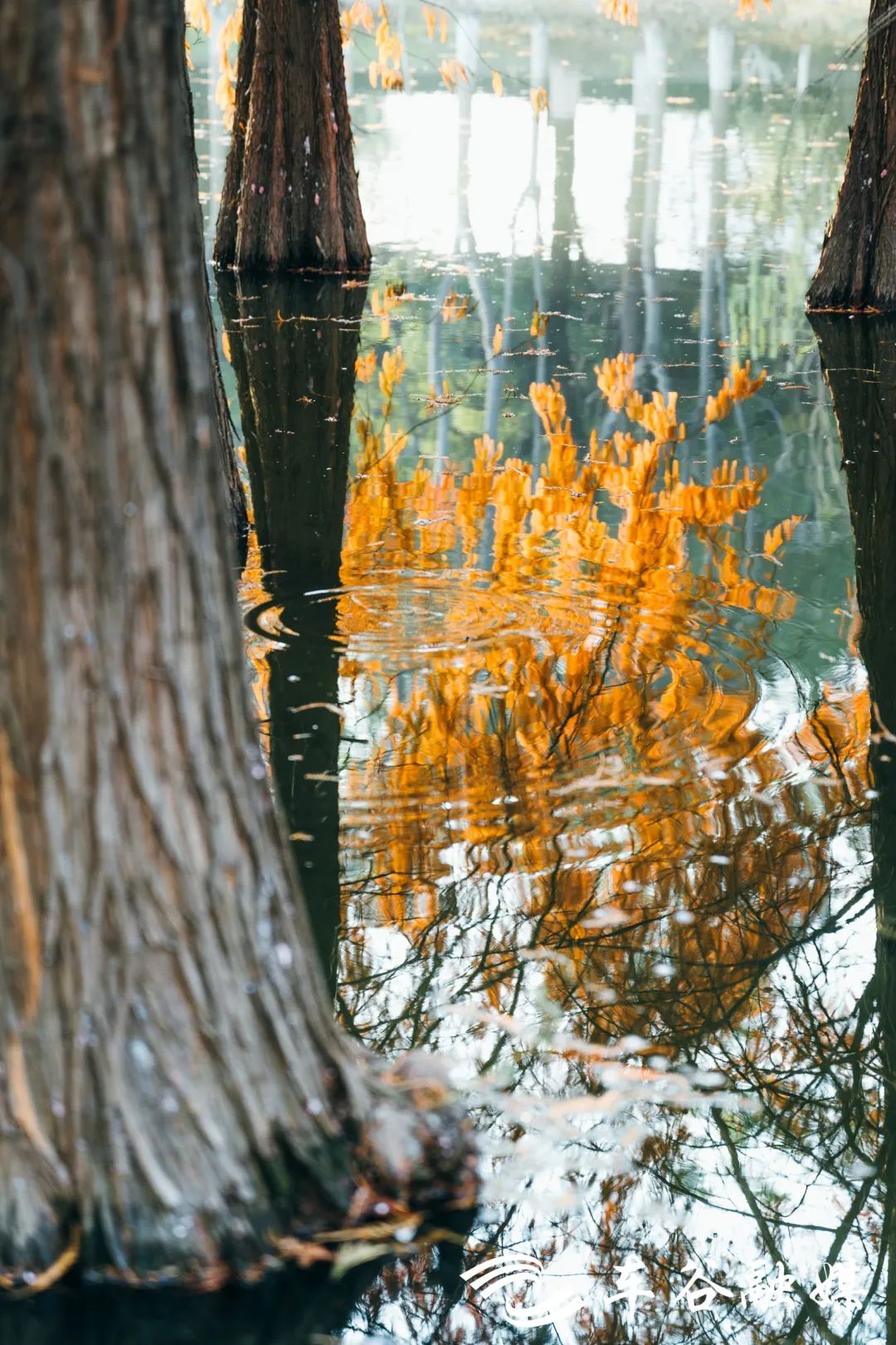橙黄橘绿的落羽杉在湖中抱团出道,组建成一片“油画森林”。树叶层层叠叠,在暖阳地轻抚下透露出点点鎏金。