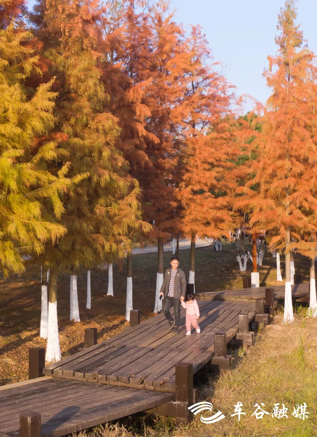 不远处的「龙灵山生态公园」秋意缱绻,漫步在九曲湾湿地步道,大片的杉树笔挺巍然,为冷冽的初冬画上浓墨重彩的一笔。