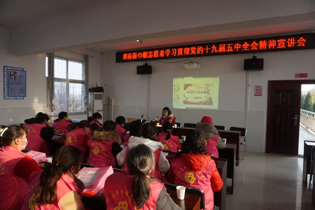 为深入学习宣传贯彻党的十九届五中全会精神,引导妇联干部和妇女群众把思想和行动统一到全会精神上来,12月24日下午,邓南街妇联组织妇女干部和巾帼志愿者在邓南街成校培训室开展党的十九届五中全会精神宣讲会,邓南街各村(社区)妇联主席、巾帼志愿者等40余人参会。