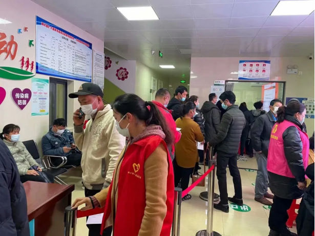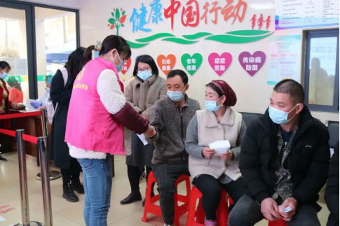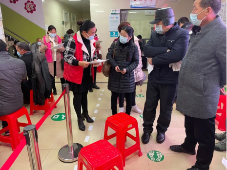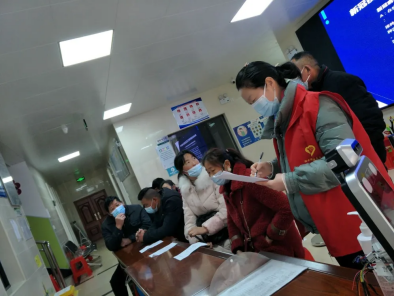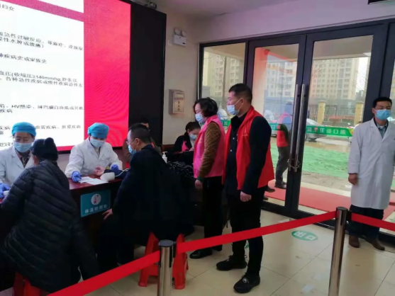 巾帼志愿者配合卫生院做好接种工作。她们负责在入口处指引辖区居民正确前往疫苗接种点的引导、登记工作