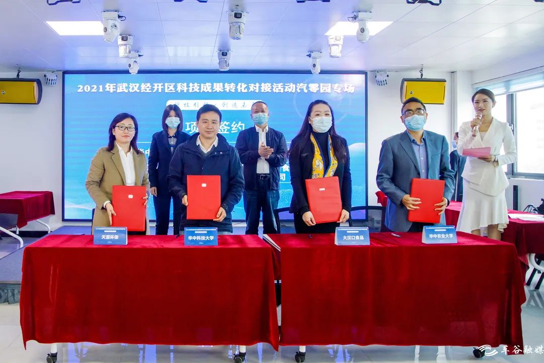 10月29日,2021年武汉经开区科技成果转化对接活动·汽零园专场在武汉市金汇泉食品饮料有限公司举行。天源环保、大汉口食品等5家企业与华中科技大学、华中农业大学等高校签约,技术合同成交额达435万元。