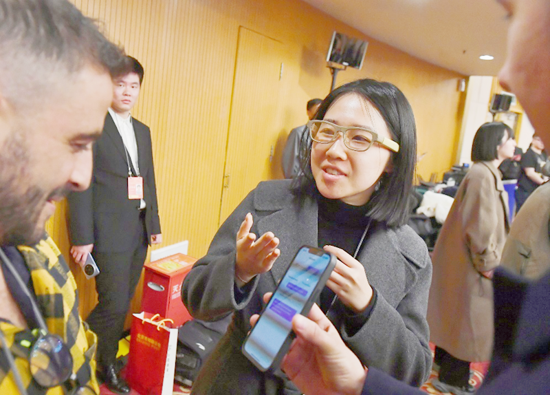 ▲2025年3月6日,全国两会现场的中国记者用星纪魅族研制的AR眼镜翻译功能和西班牙记者鲁索进行西班牙语对话。