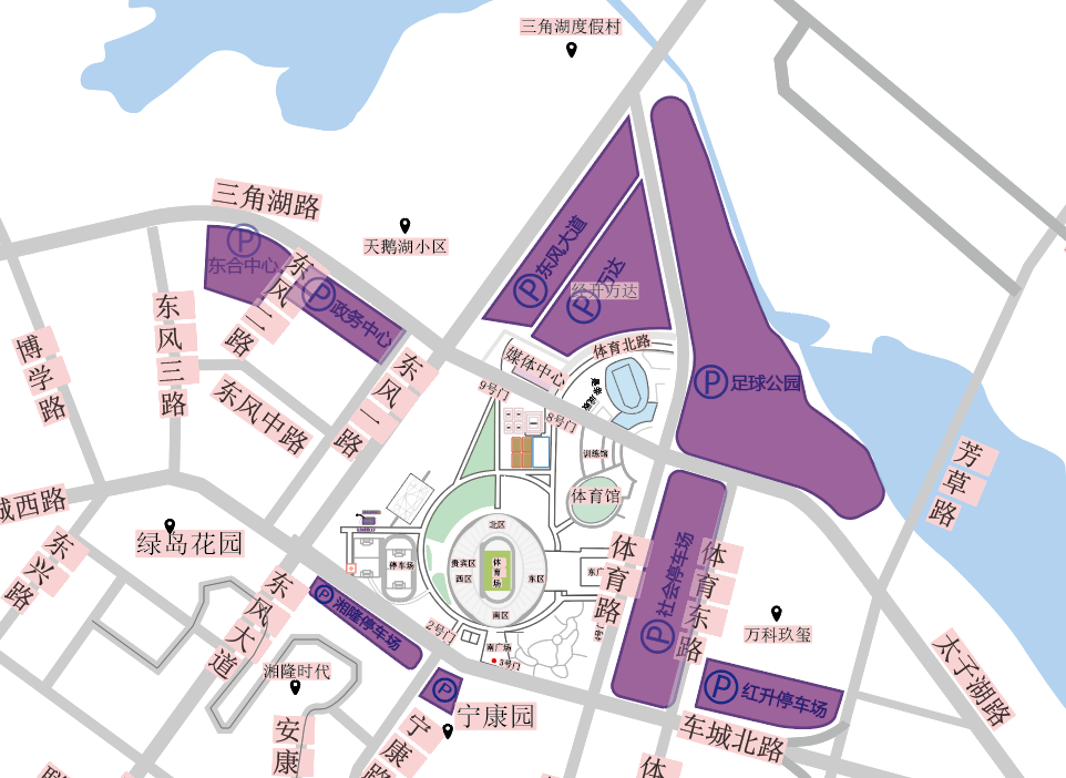 (4)龙阳大道-东风大道-体育路-太子湖路-体育中心社会停车场/足球公园停车场。