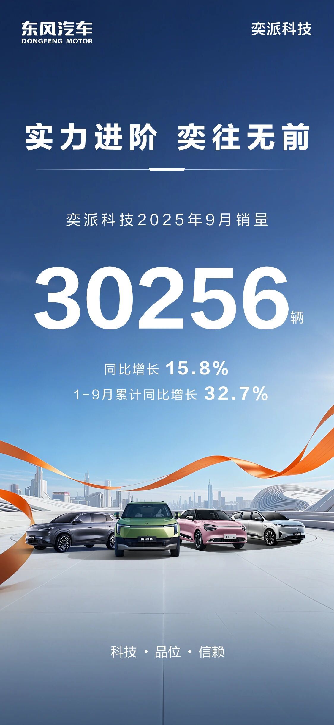 10月1日,东风奕派汽车科技公司(简称“奕派科技”)公布9月销售数据:2025年9月,奕派科技销量30256辆,同比增长15.8%,单月销量再创新高,跻身“新势力3万俱乐部”,2025年1月—9月,奕派科技销量同比增长32.7%。