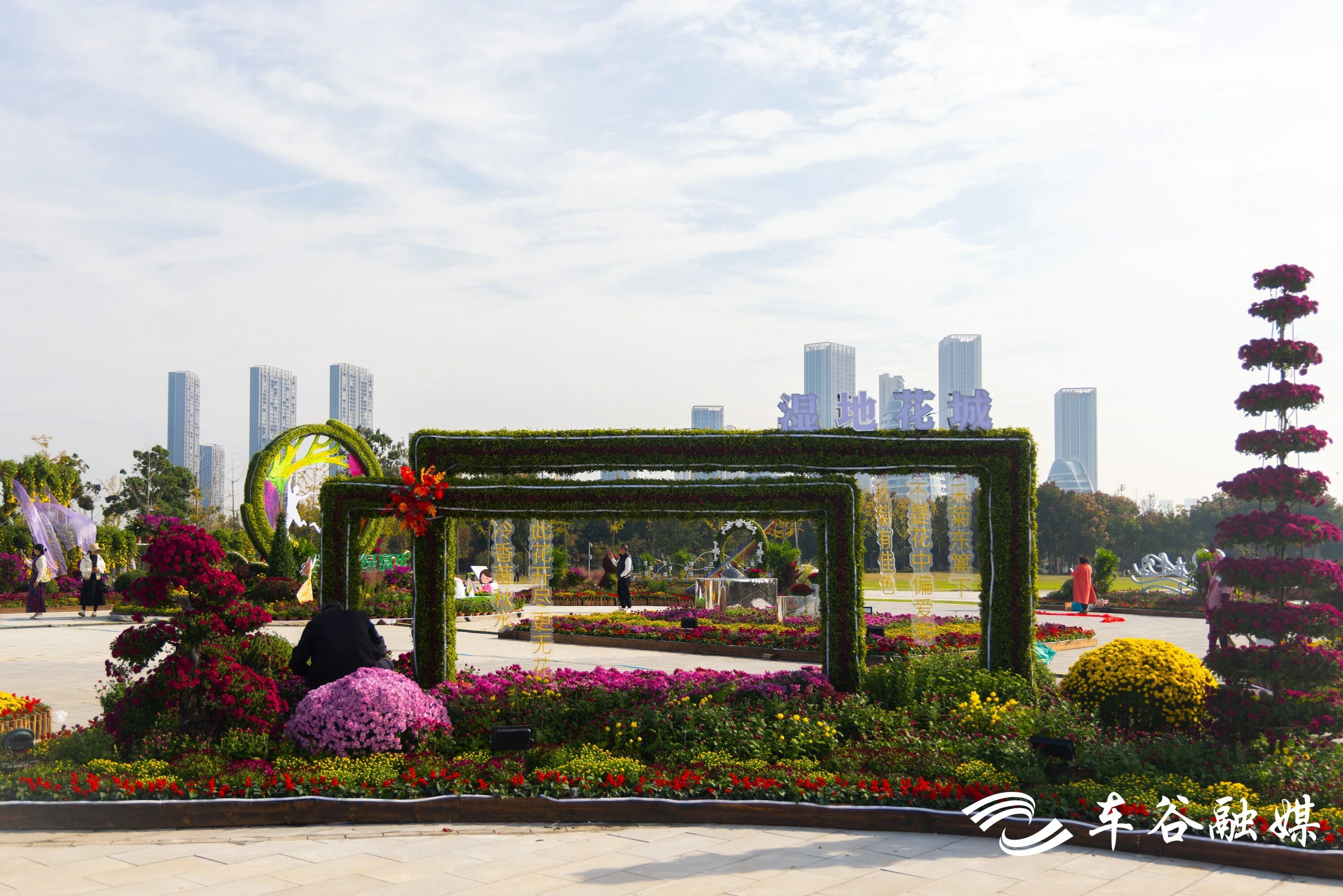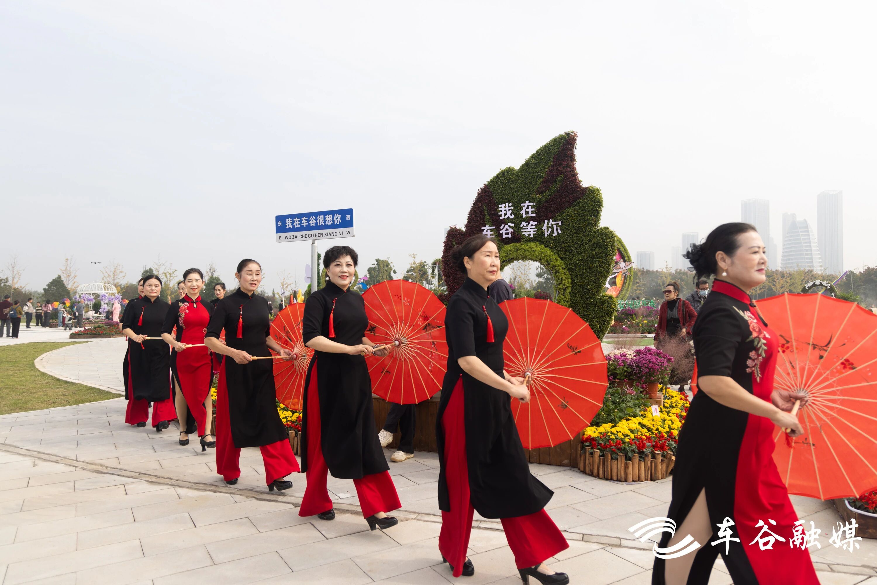 来自区文化馆的老年艺术团手持油纸伞在花坛间穿行,表演现场走秀;背菊花诗、品菊花茶活动现场,孩子们的诵读声此起彼伏,市民与书法、绘画老师共绘一幅画、共写一幅字,花香、墨香、茶香扑面而来;同时,菊展还特设房地产超市活动,联合招商未来中心、车都项目等楼盘推出“金秋安家计划”,推介经开区优质房地产项目。