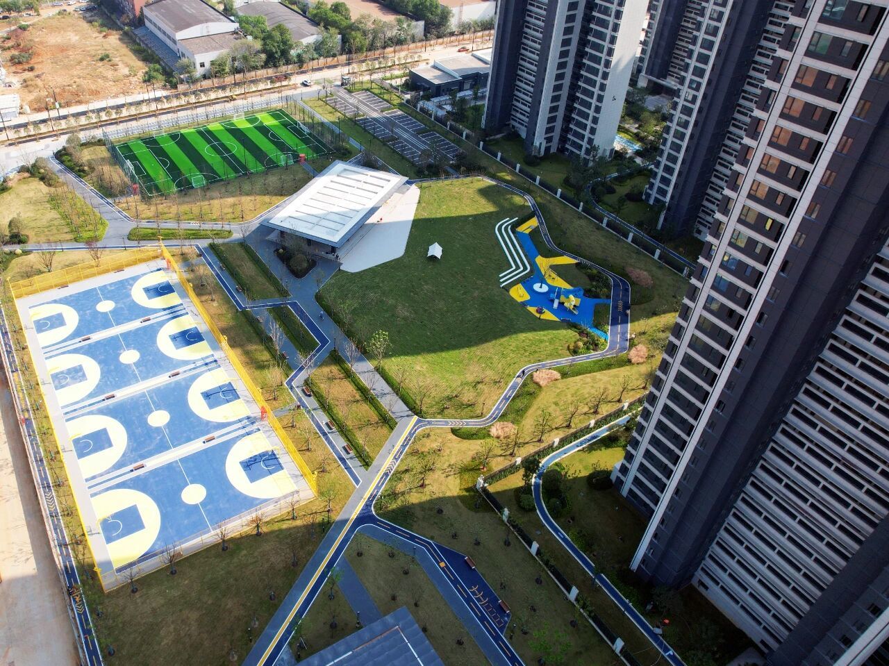 2025年7月,武汉经开区首个非标商业“花园里”正式开业,餐饮、健身、超市、教育等多元业态相继入驻。同时,小区还建有神龙小学朴真校区和武珞路中学经开分校两所中小学;孩子们可以在社区广场上露营,社区书店里阅读绘本;遛狗的业主还有一块封闭专属区域,以免打扰他人;喜欢足球的业主可在社区足球场上肆意挥洒汗水,感受足球单纯的快乐……
