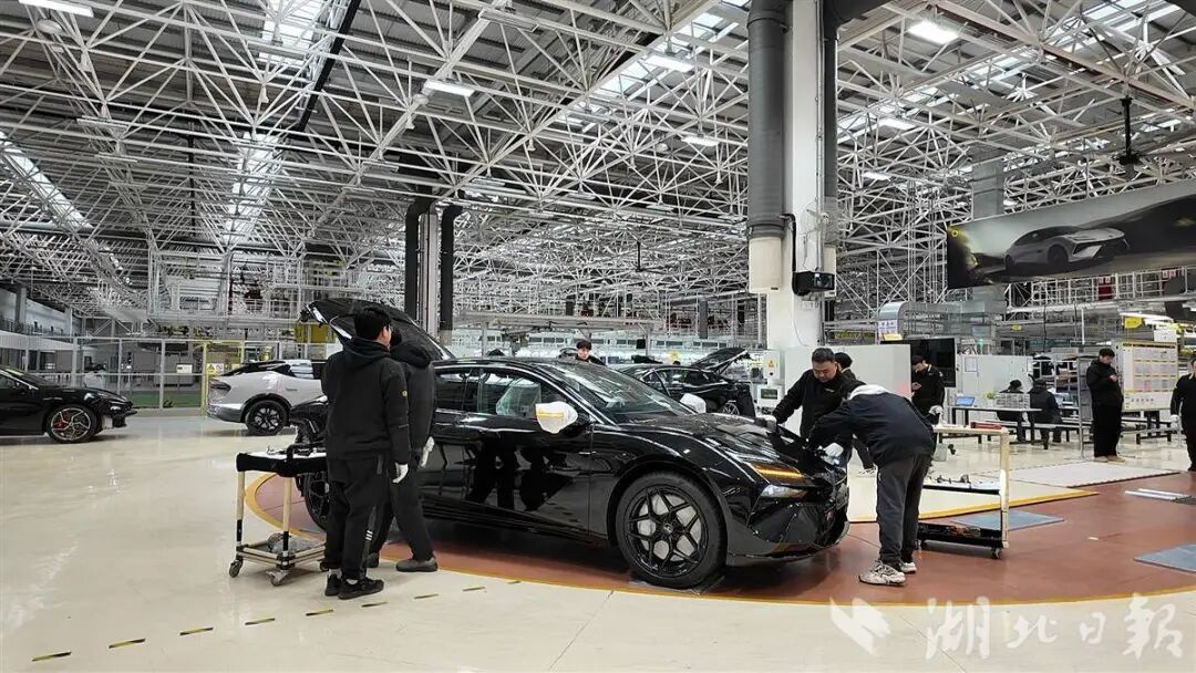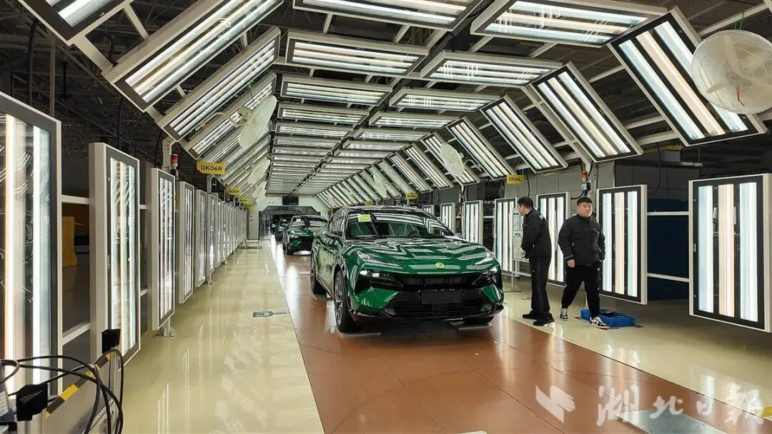▲位于武汉经开区的莲花汽车全球智能工厂,工作人员正在总装车间内作业。