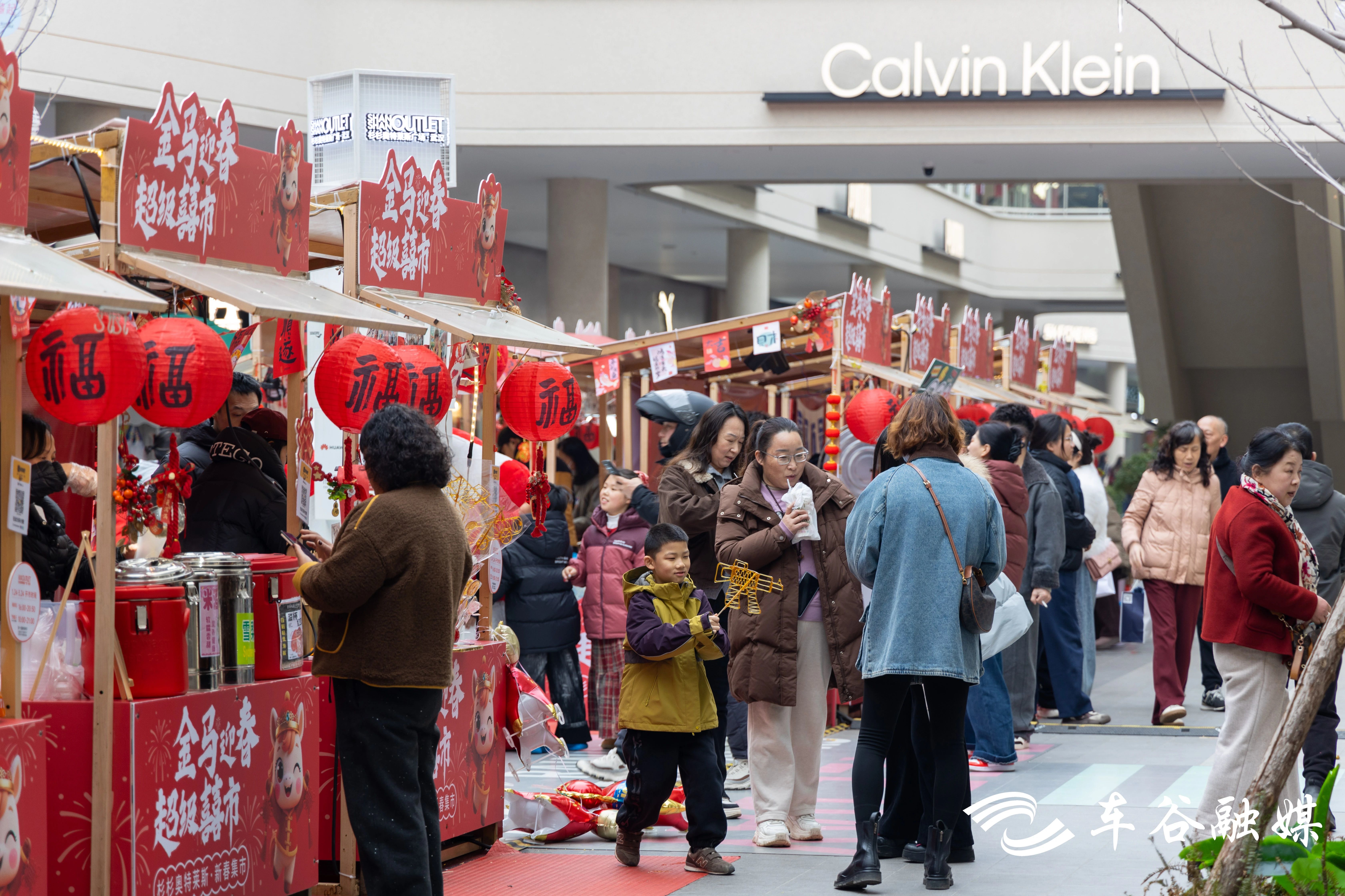 走进武汉杉杉奥特莱斯,刚停好车就感受到节日氛围:卖场大门的树上也系上了红围巾,市民走进商场前,先敲响铜锣迎接新年。中庭广场后面,金马迎春超级喜市里摊位次第铺开,鸡蛋仔、棉花糖、冰糖葫芦、章鱼小丸子等摊位前不少市民排队购买,成为市民逛街“补给站”。