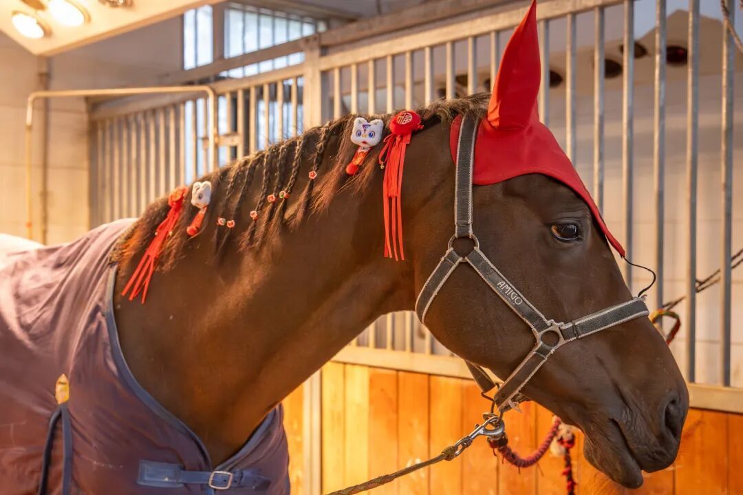 校园里,年味十足。马房、训练场贴上了春联,留校师生给马编起红绳辫子、戴上醒狮发夹、换上红耳罩,饲料里添了它们喜爱的苹果和胡萝卜。对他们而言,朝夕相处的马儿,本就是“家人”。