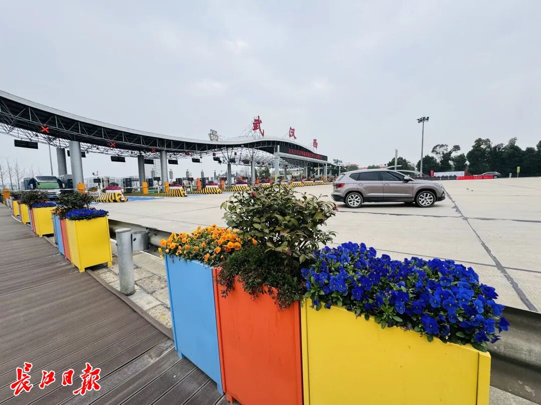 记者在现场看到,收费广场整洁开阔,彩色车道清晰醒目,立体花箱错落有致,通行秩序井然。进城方向右侧建有一座爱心小屋,旁边修建了一条栈道,摆放着桌椅供过路司机休憩。不远处,春风拂过,麦田绿意盎然,几只喜鹊不时从上空掠过,停留在旁边栽植的桂花树和红叶石楠上,一派生机勃勃。