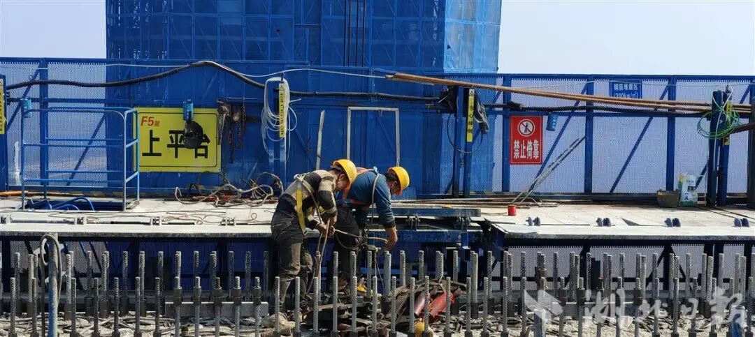 此时,来自贵州遵义的两名建筑工人——35岁的张建成和27岁的刘园,身上系着安全绳,正在平台上作业,“主塔浇筑完成第30节,即将开始浇筑第31节”。
