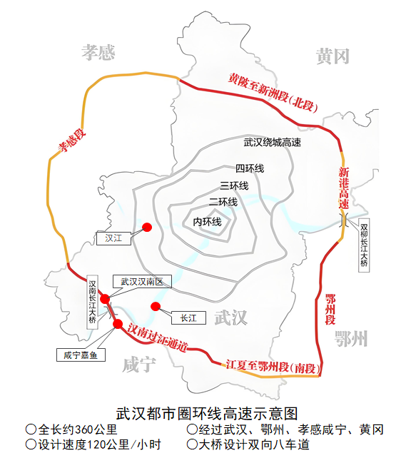 武汉都市圈环线高速公路相当于武汉六环线,全长360公里,双向八车道,设计时速120公里,串联武汉、孝感、咸宁、鄂州、黄冈。汉南长江大桥及接线工程是其重要组成部分,起于蔡甸区通航产业园,止于江夏区山坡街南侧,全长72.5公里,总投资289亿元,由武汉城发集团所属武汉交投集团汉南桥公司投资建设。