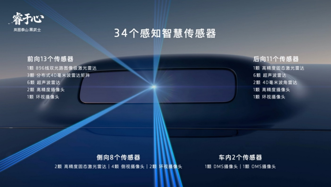 岚图泰山Ultra及黑武士搭载了华为最新的乾崑ADS V4.1激光雷达方案,配备了包括激光雷达、高清摄像头、毫米波雷达、超声波雷达在内的34颗高精度传感器,构建起全场景无死角的感知网络。