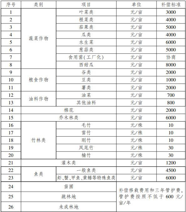 注:1.温室大棚等补偿标准可在此基础上适当提高;