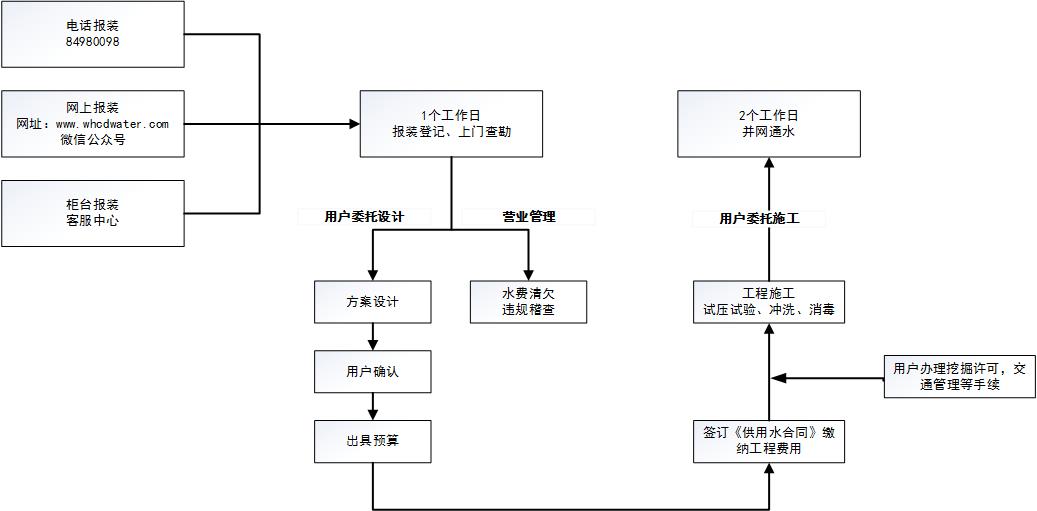 发展新用户,资料齐全时,1个工作日内完成报装登记、上门查勘;施工完毕后(含冲洗、消毒、试压等通水前全部工序),2个工作日内完成并网通水。