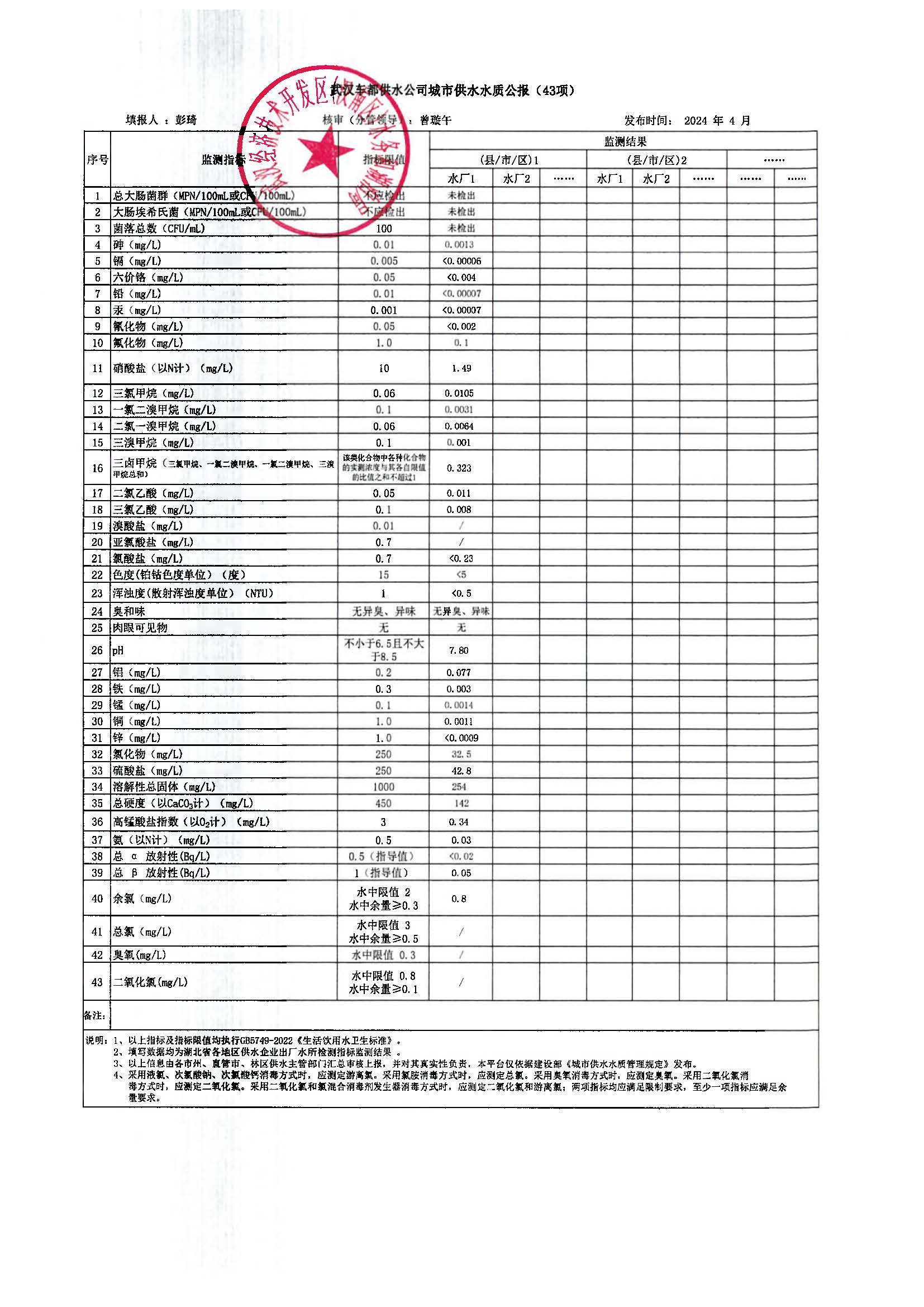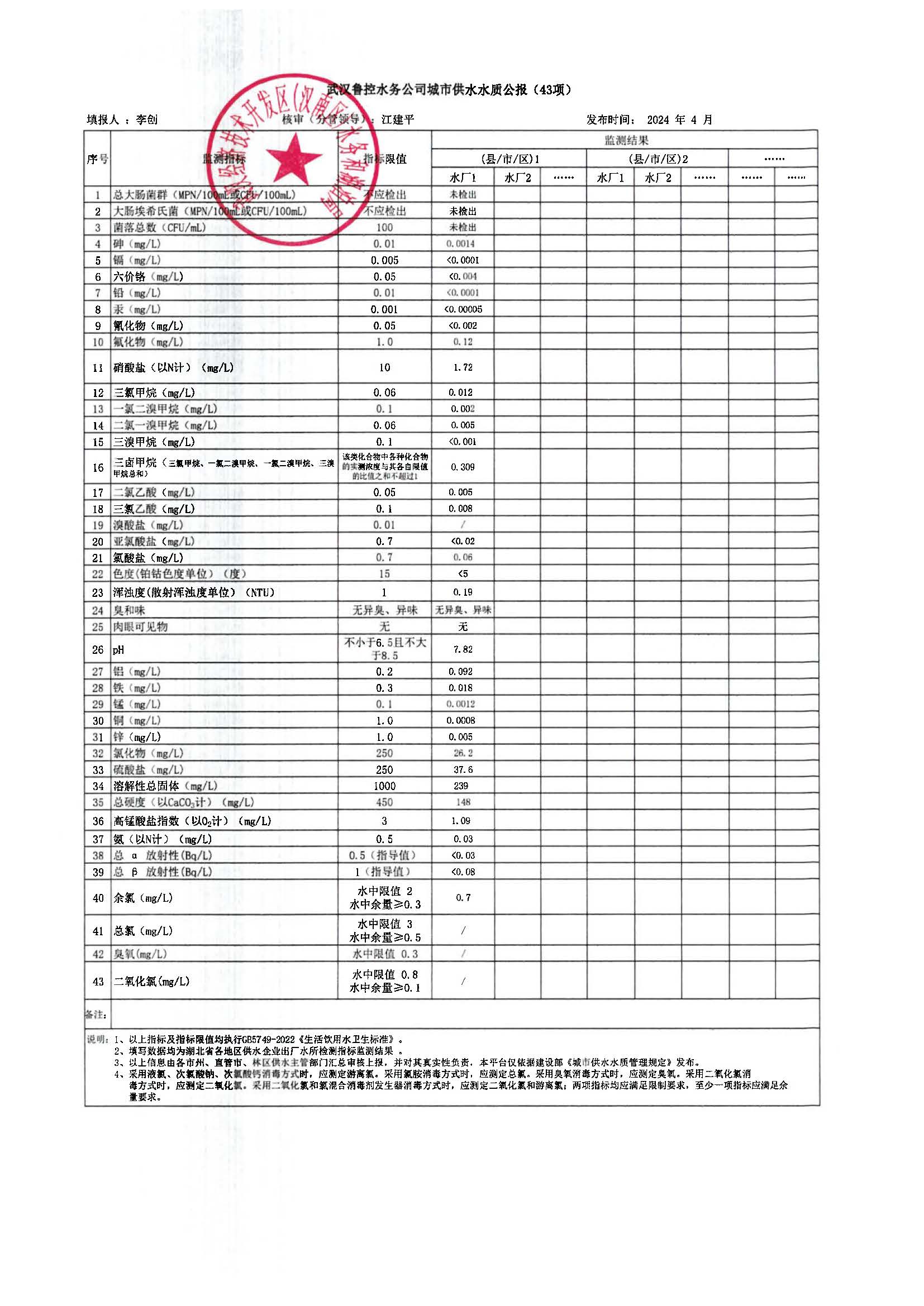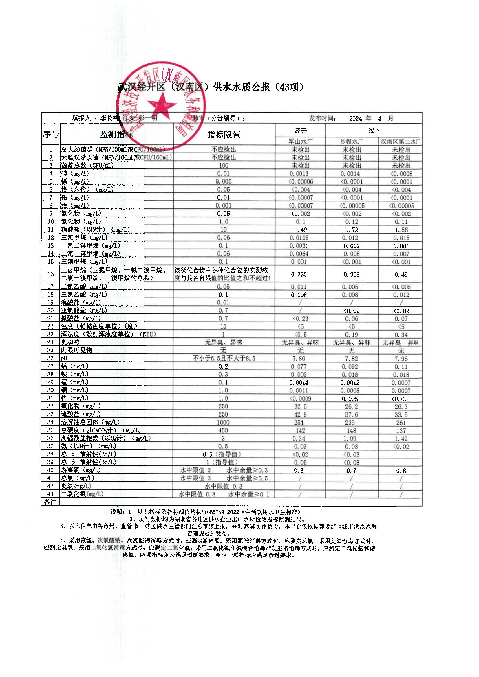 武汉经济技术开发区(汉南区)2024年4月城市供水水质公报
