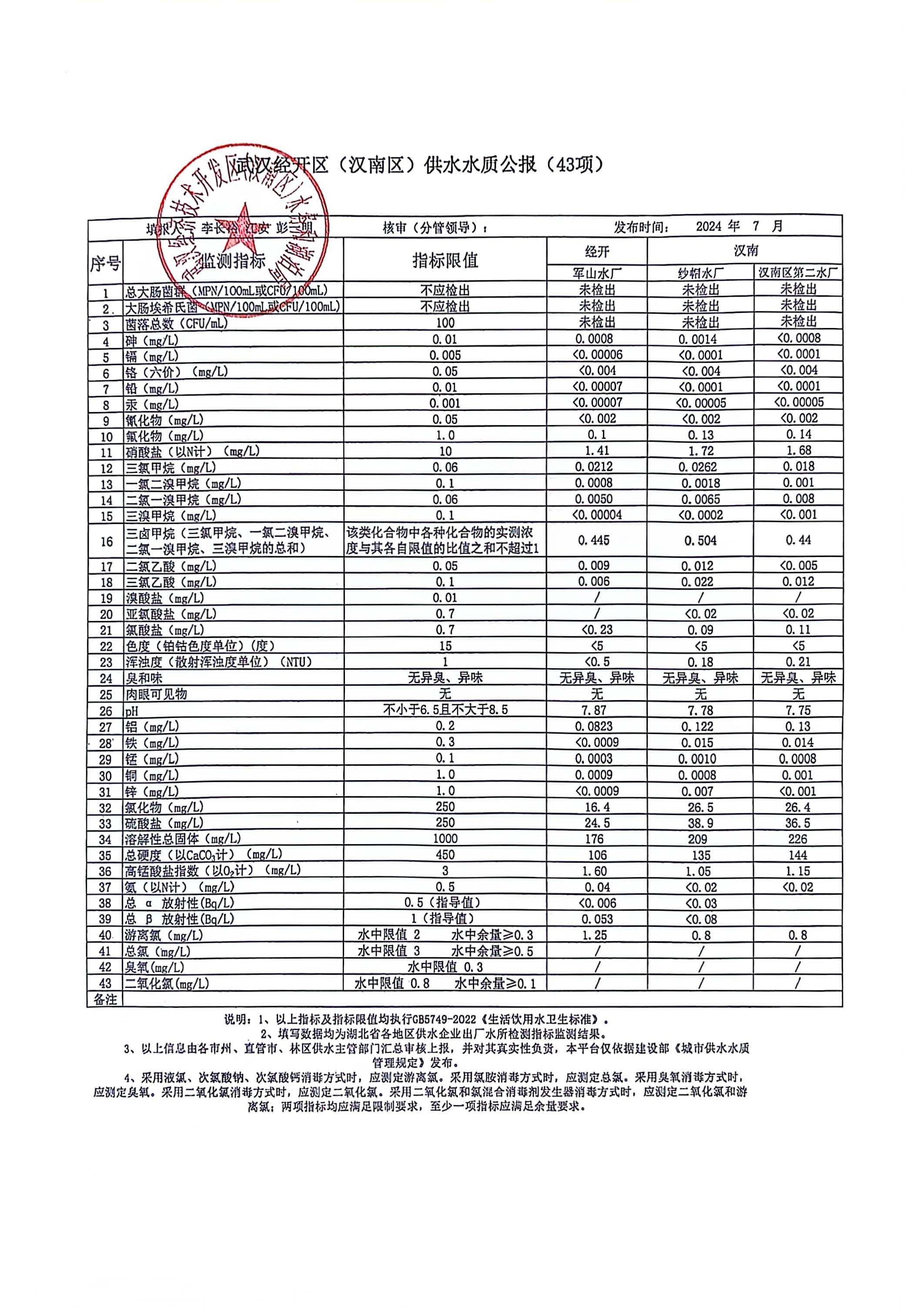 武汉经济技术开发区(汉南区)2024年7月城市供水水质公报