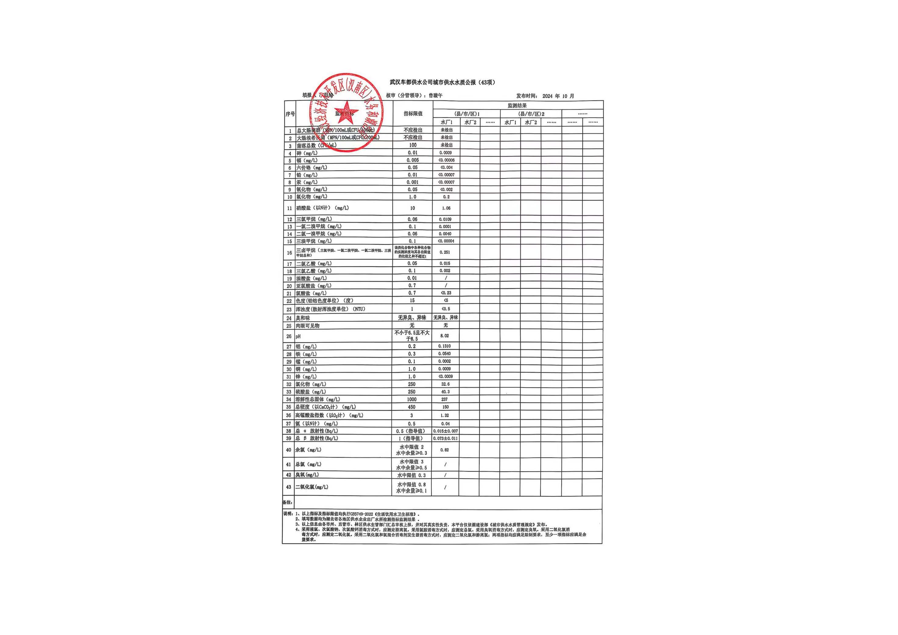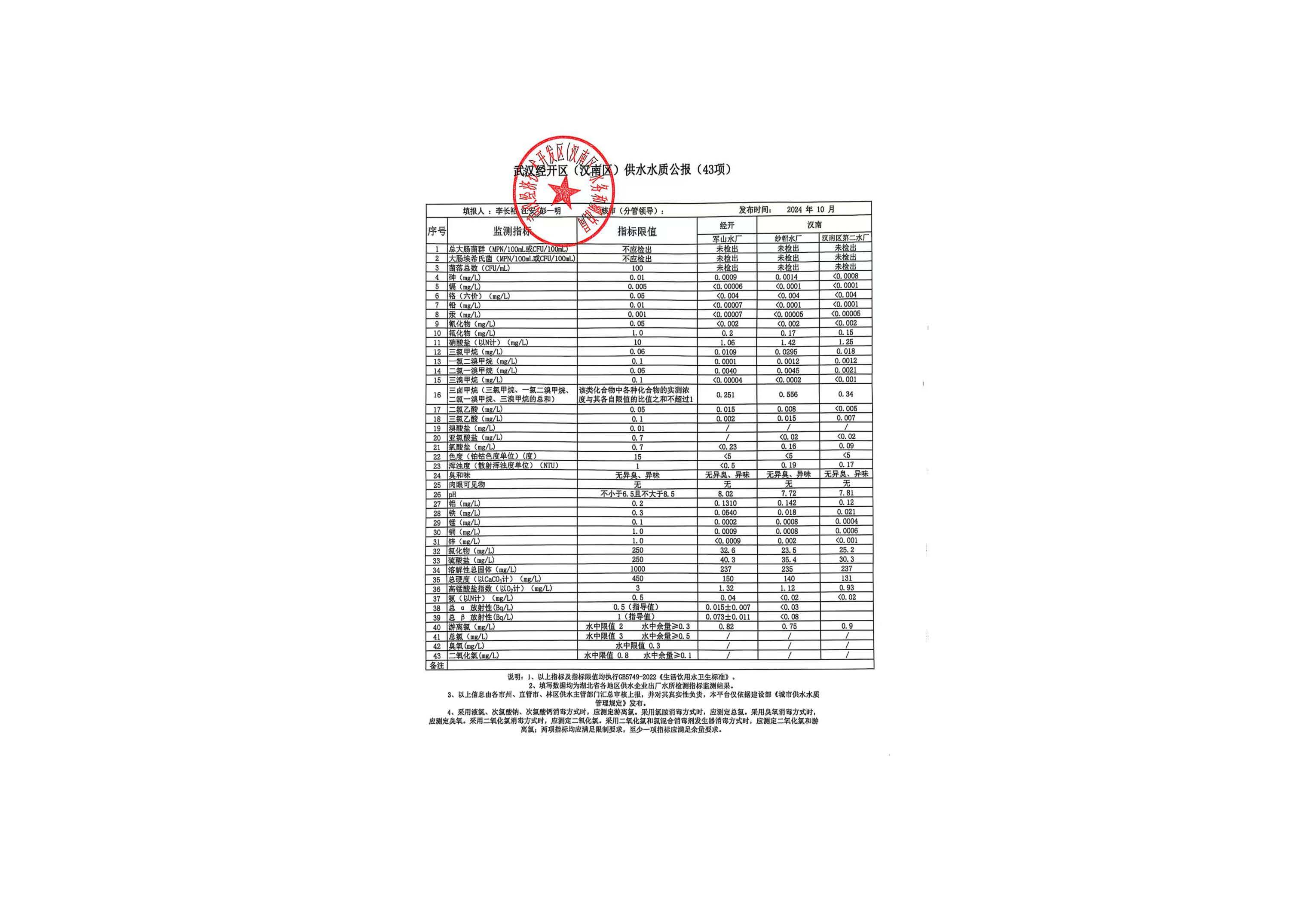 武汉经济技术开发区(汉南区)2024年10月城市供水水质公报