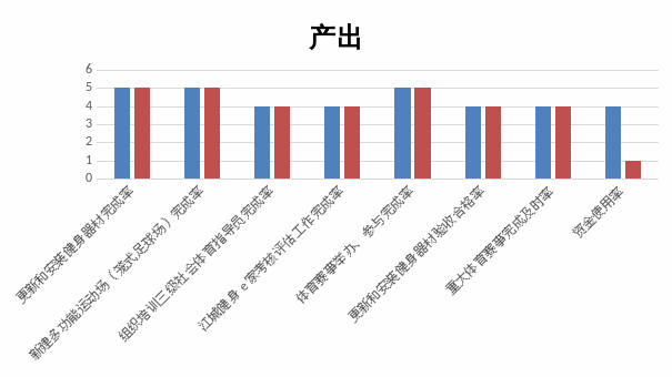 产出指标主要从更新和安装健身器材、新建多功能运动场(笼式足球场)完成率、组织培训三级社会体育指导员完成率、江城健身e家考核评估工作完成率、体育赛事举办、参与完成率、更新和安装健身器材验收合格率、重大体育赛事完成及时率、资金使用率这八个方面来进行评价。对于该项的评价,评价小组主要采取了卷宗研究和现场访谈的方式进行打分和评价。经过综合计分,产出指标得分为32分,评价等级为优。