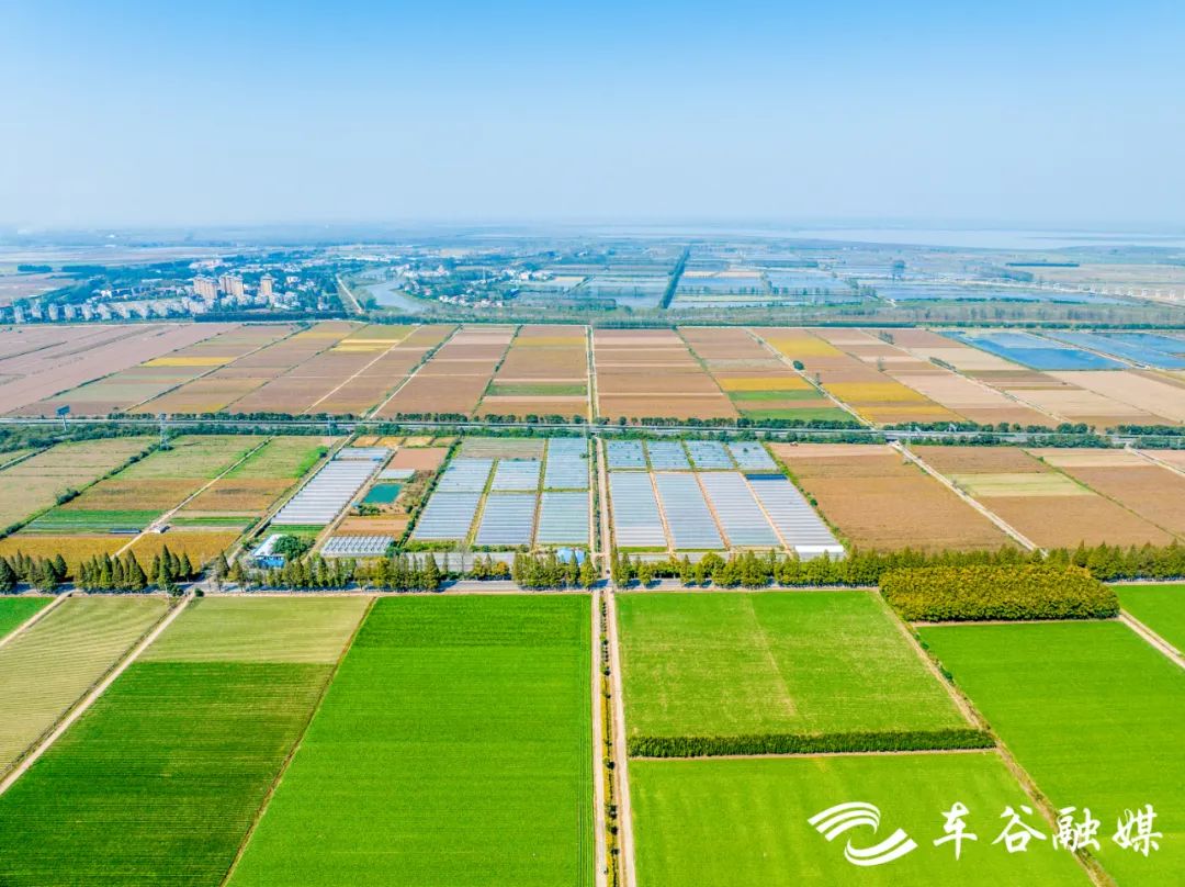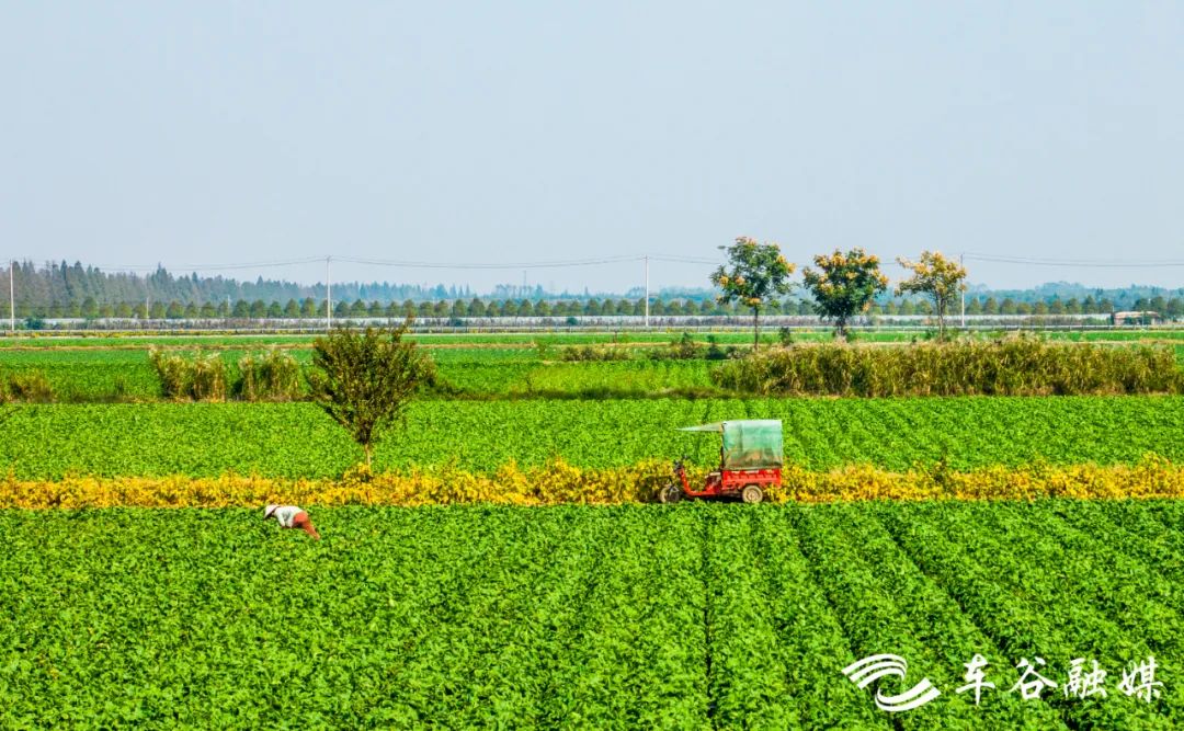 穿过一片村居房舍,眼前出现一大片菜地。菜垄齐齐整整,绿意从脚下向田野的尽头铺展开去。路的另一侧,满目金黄,对比鲜明。