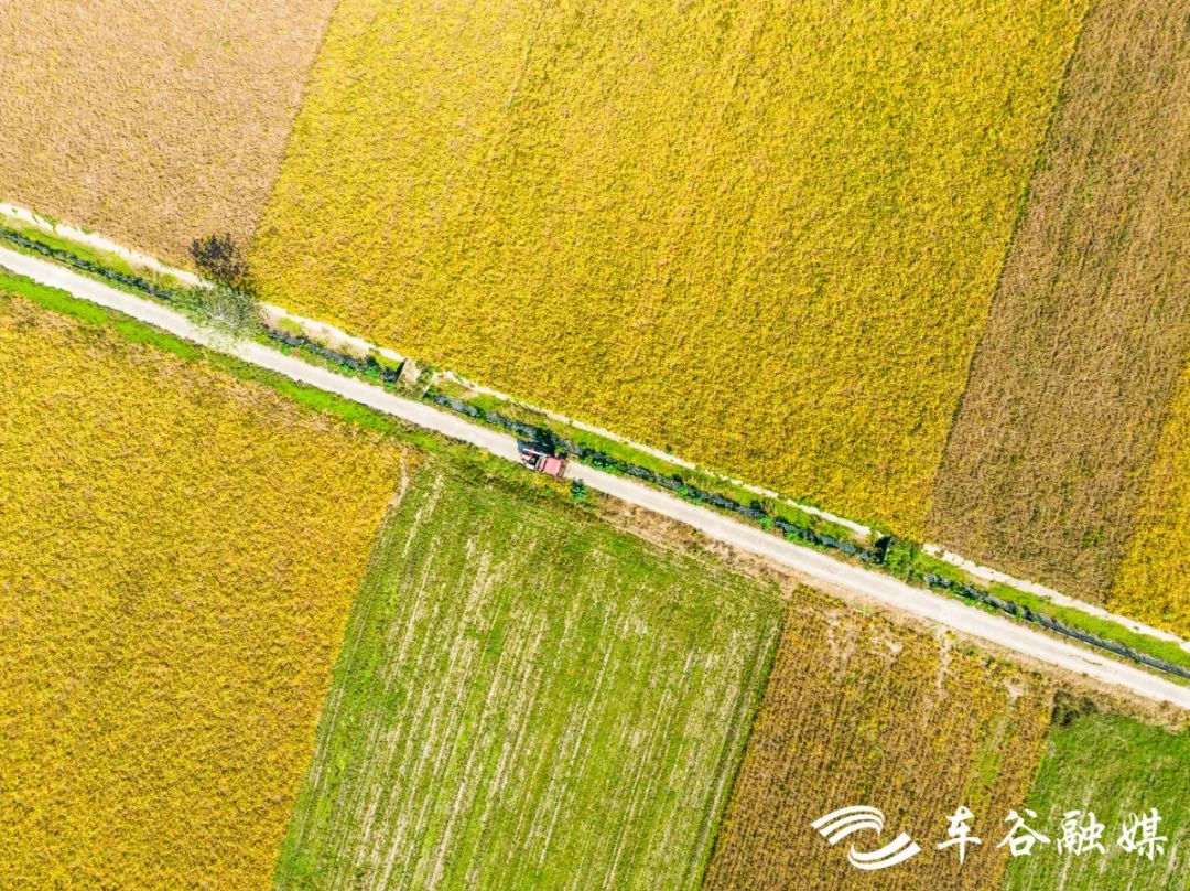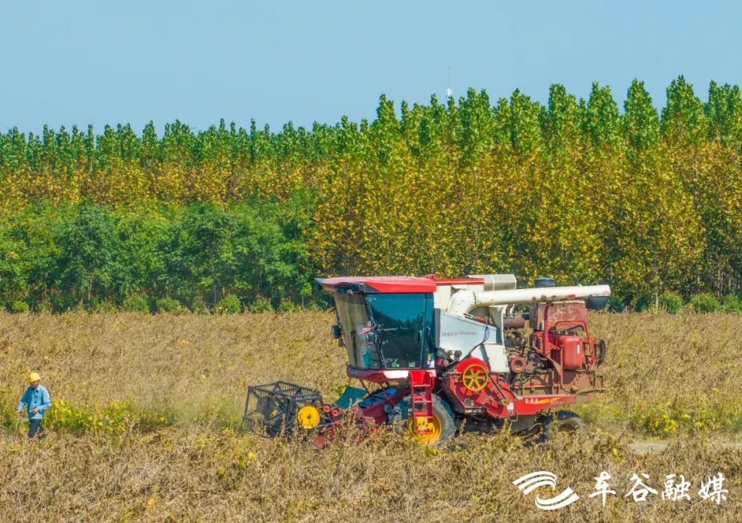 耳边传来收割机作业的隆隆声。哦,这里的大豆也正在收获。金黄,是这片土地的主色调。