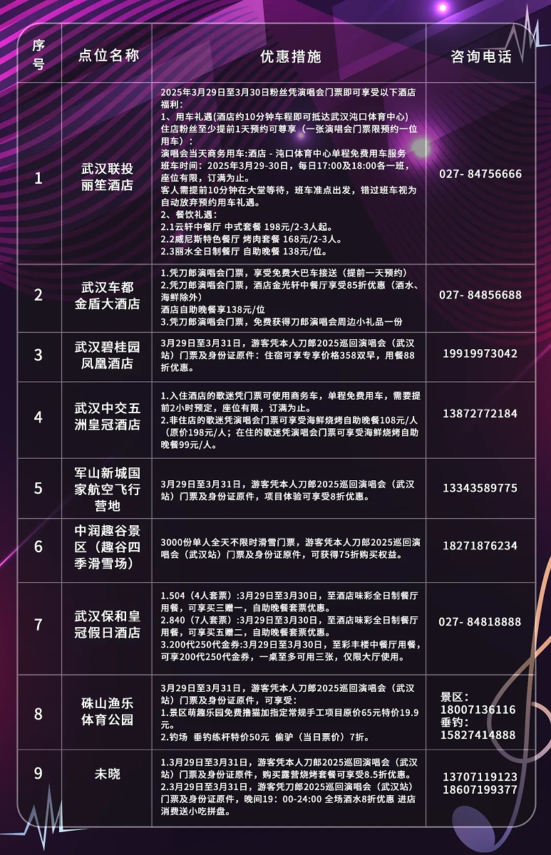 此外,军山新城国家航空飞行营地、中润趣谷景区(趣谷四季滑雪场)、硃山渔乐体育公园、未晓等多家武汉经开区的景点、餐厅也推出了针对刀郎歌迷的优惠活动。