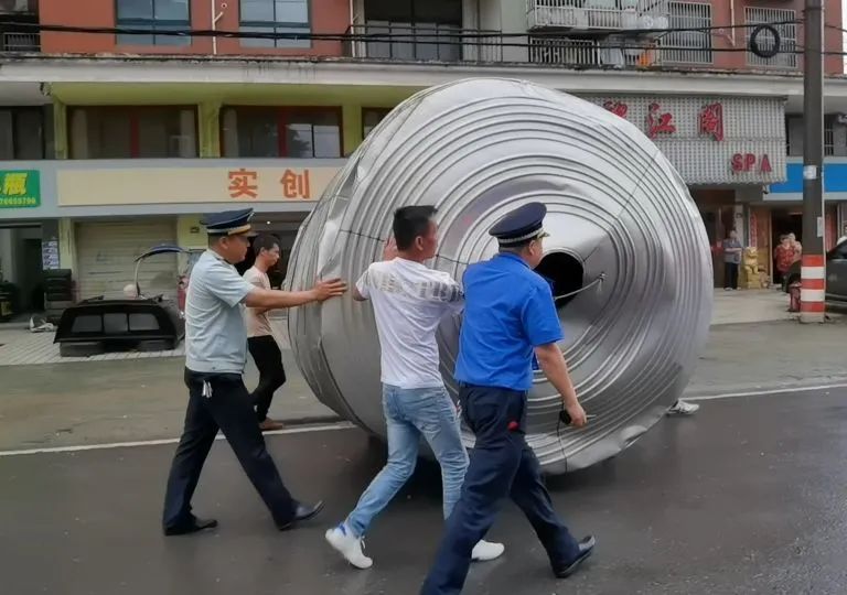 恶劣天气造成纱帽街滨江路一个大铁桶在路面来回滚动,影响车辆安全通行。纱帽街综合执法中队副中队长程二林在巡查过程中发现问题后,带领队员紧急设置路障,联系拖车合力将铁桶转运,解除险情。