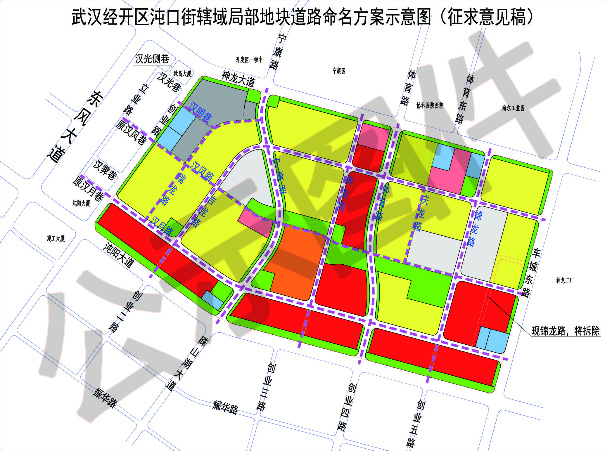 沌口街辖域局部地块(沌阳大道、创业路、神龙大道、车城东路围合,主要为原神龙一厂用地)的用地规划调整方案已获市政府批准,地块内增加了数条规划道路和公共通道(统称为道路)。按照相关规定,区民政局、自然资源和规划局经研究会商,提出了道路命名方案,现按相关程序规定予以公示,广泛征求社会公众的意见和建议。