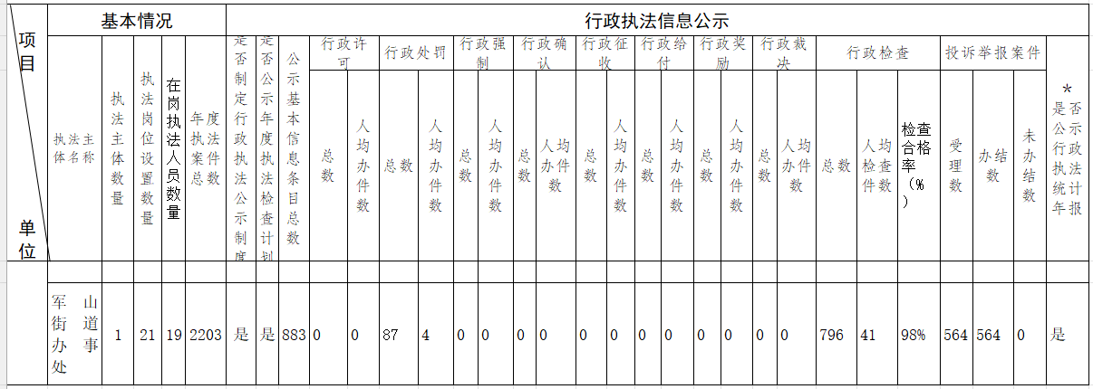 军山街道办事处2022年度行政执法统计年报表
